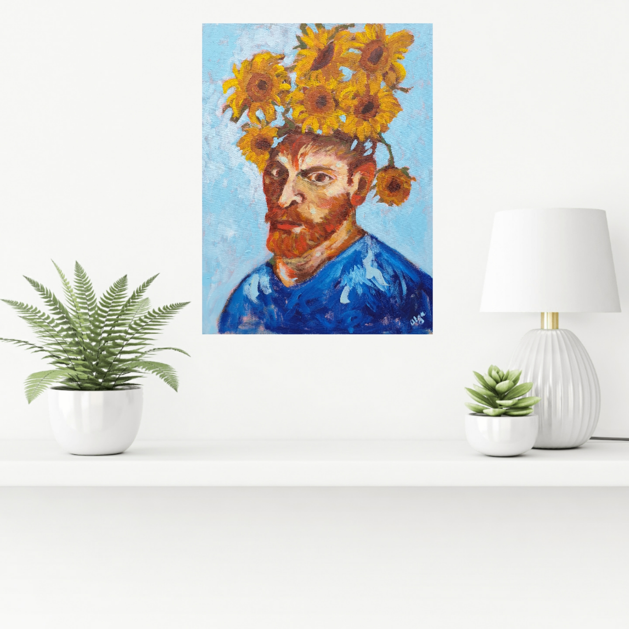 Portrait with Sunflowers – Homage to Van Gogh by Olga Megele – Acrylic on linen, ready to hang. Framed image is an example only.