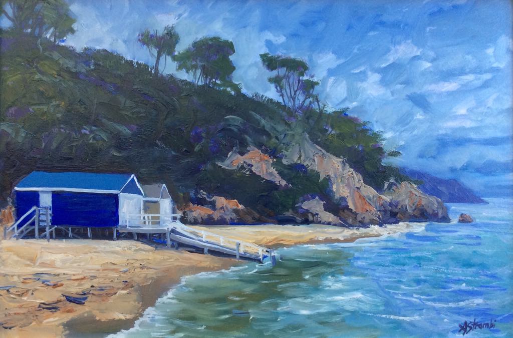 Portsea Beach Huts by Anne Strambi – This painting of two beach huts at Portsea in Victoria was painted using thick oil paint mostly with a palette knife so has lots of texture. I enjoyed painting the varying tones in the water, the foliage and rocks on the headland and the details of the huts. With thanks to Rod Moore for the lovely photo reference. The painting is ready to hang in a double frame which measures 50 cm x 38 cm. The painting itself measures 38 cm x 25.5 cm.