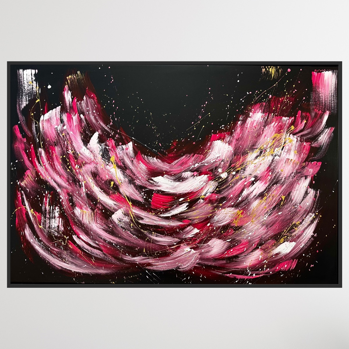 Framed in black, this painting represents the sense of contentment and power that comes with freedom. Organic in nature, this painting is made up of many intentional layers of hard lines and blended. There is metallic gold that changes in the light and is framed in black to make a beautiful statement.