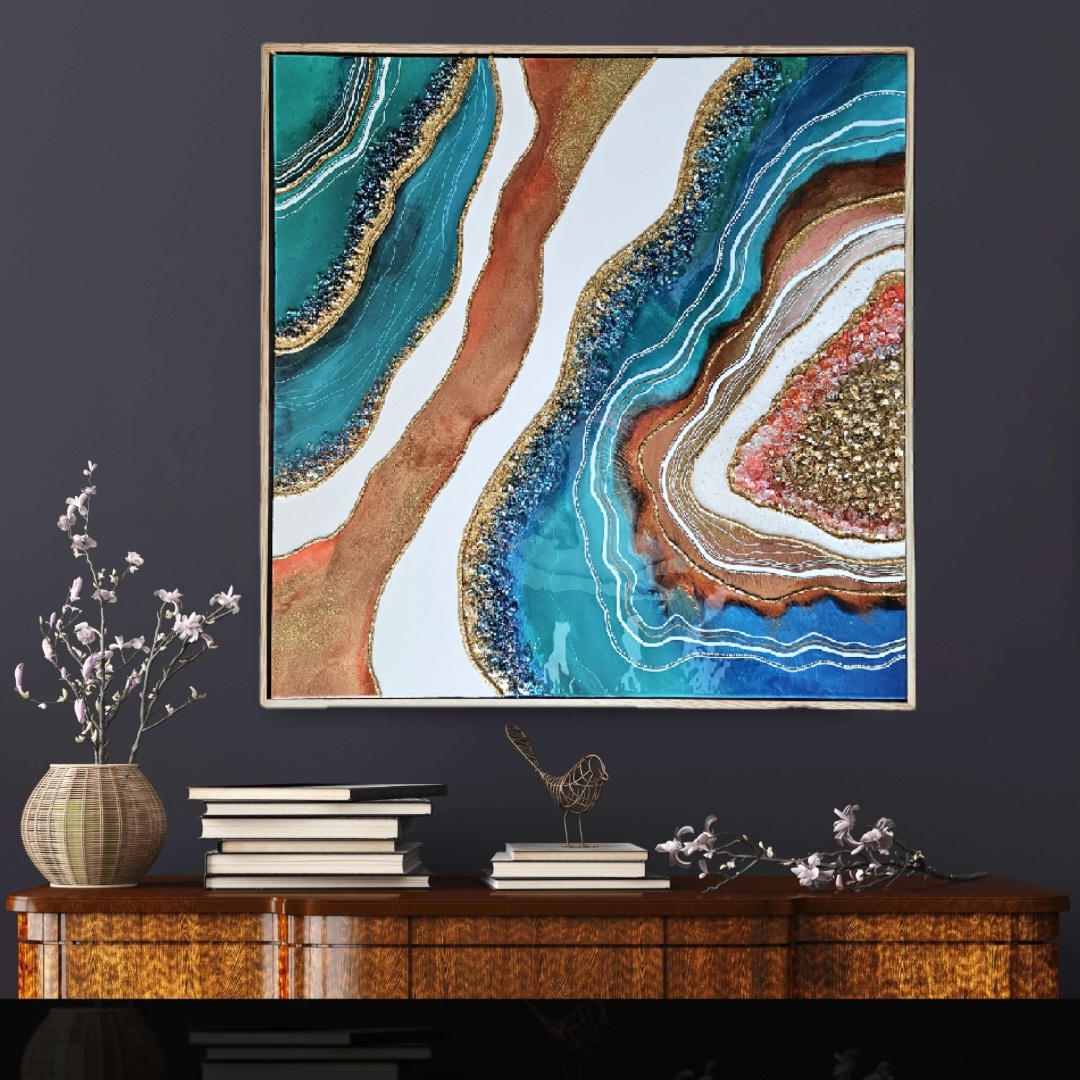 Bring luxury design , prosperity and joy with this geode inspired wall artworks in a green/aqua/blue & gold color scheme and crystals&gemstones to your home.