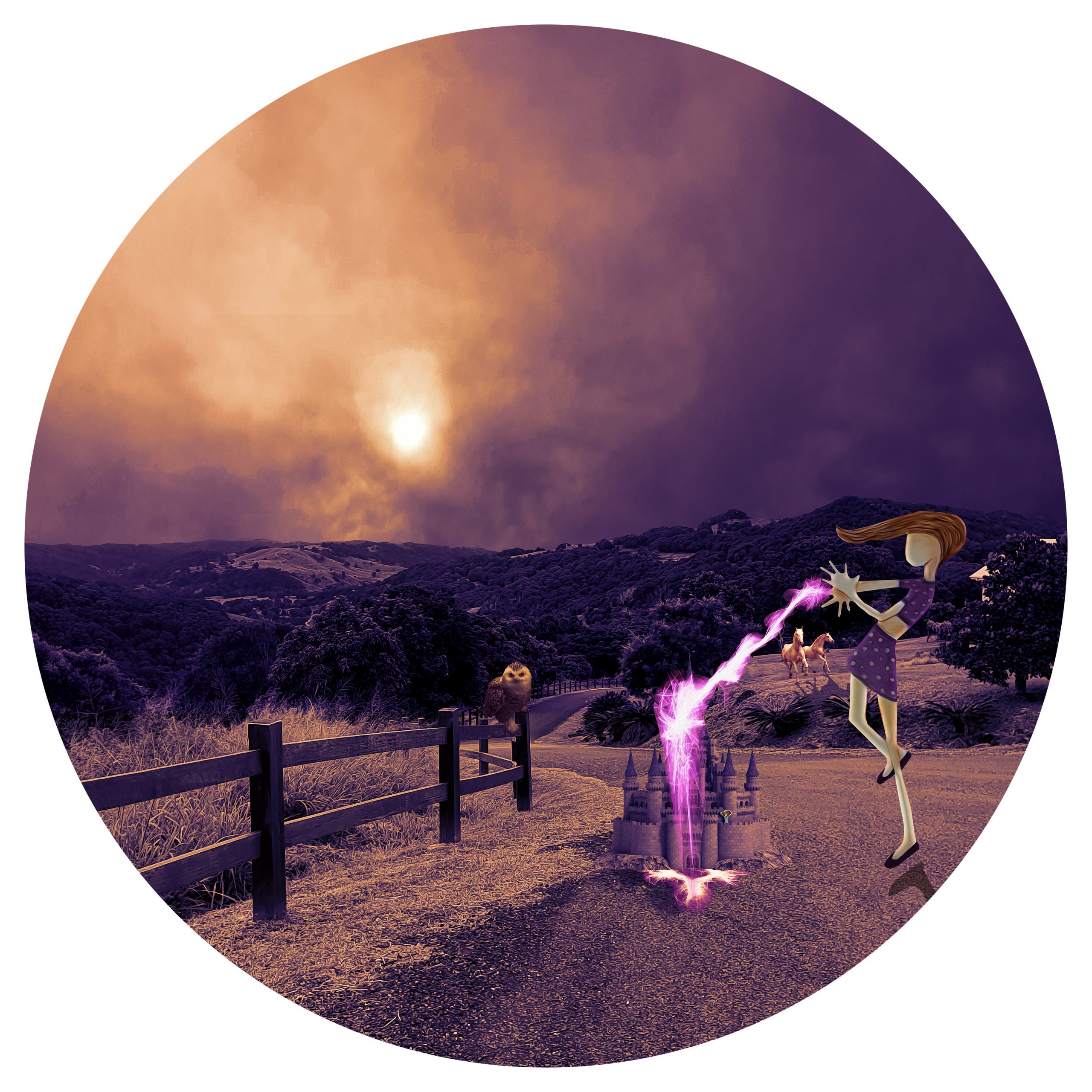 Powering the Intention (2021) illustrates energising our intentions through focused thought. In this work, the pink light refers to visualising our intentions; the horses represent the endurance and confidence needed to continue on a desired path while the miniature male figure in the castle represents the desired intention.