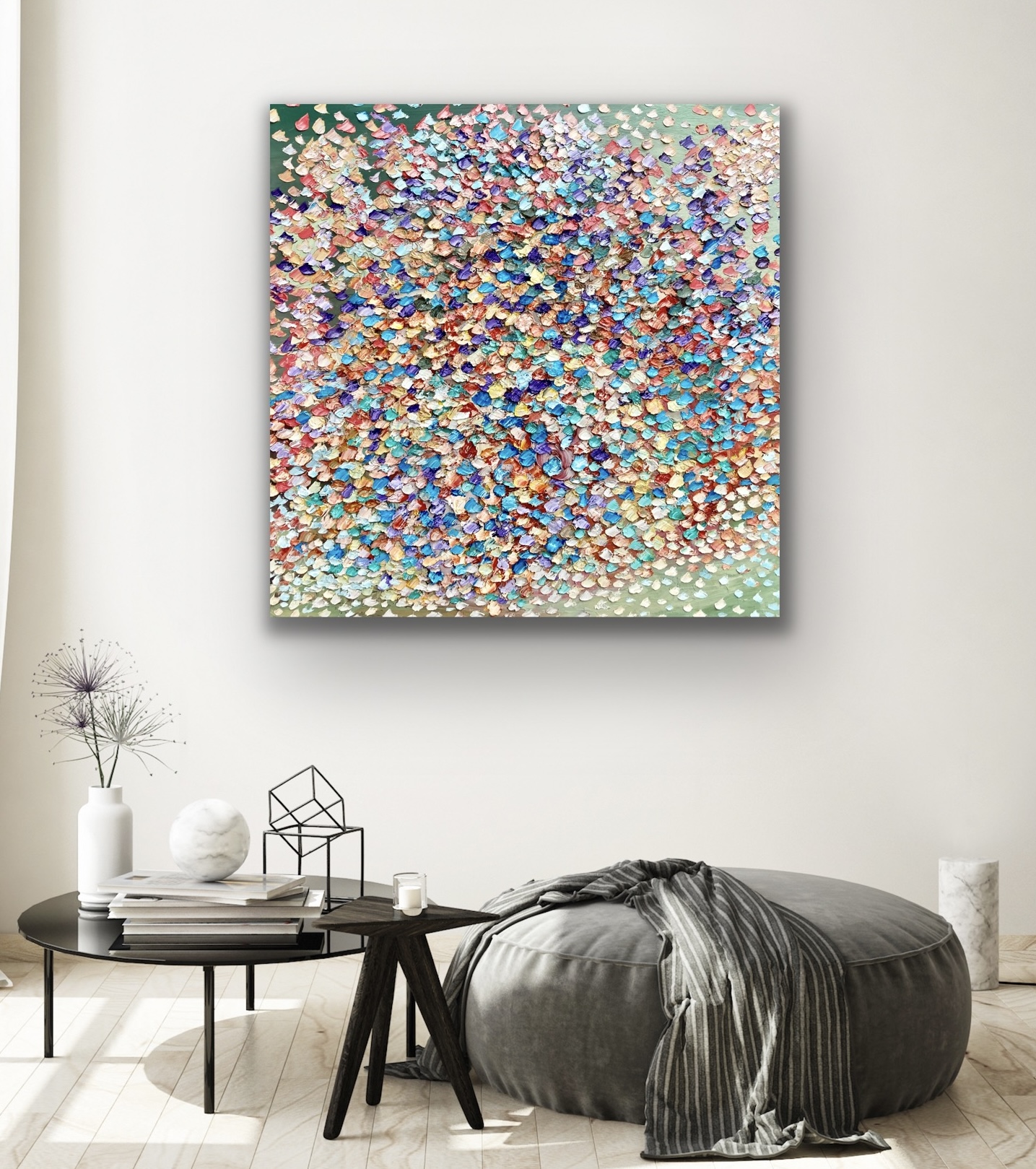 Precious Petals is a painting of beautiful bouquet of coloured petals weeping on to the landscape. Petals are painted in thick rich oil paints with a pallet knife to capture the richness of the colours of the petals and to give a lot of depth to the painting. Weeping petals from the forest creating a veil of colours, dancing over the land. Hope with this s work it makes the viewer feel very peaceful and tranquil. The painting does not come with an external frame.This painting is signed and dated 2022 at the back of the painting and comes with a certificate of Authenticity.