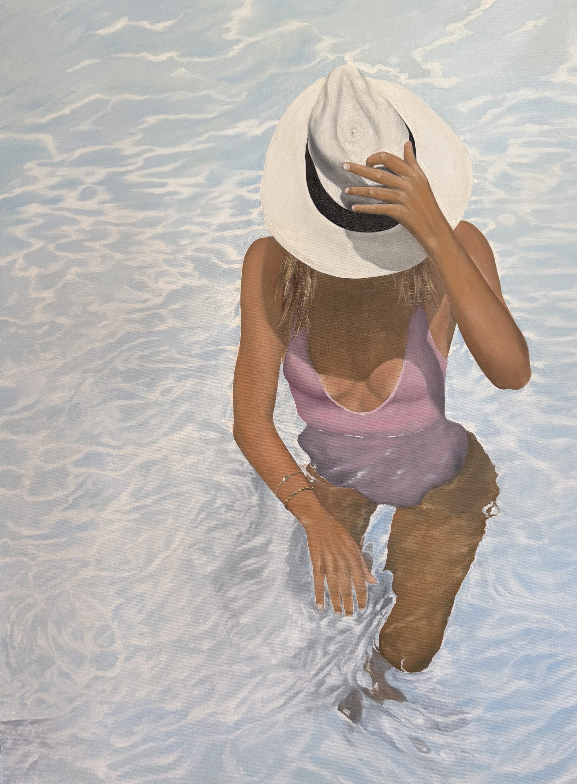Inspired by the carefree elegance of coastal summers, the painting evokes themes of relaxation, escape, and the simple joy of feeling sun and water on the skin. The anonymity of the figure invites the viewer to step into the scene, making the moment both personal and universal — a quiet pause in time where the world slows to the rhythm of the tide.