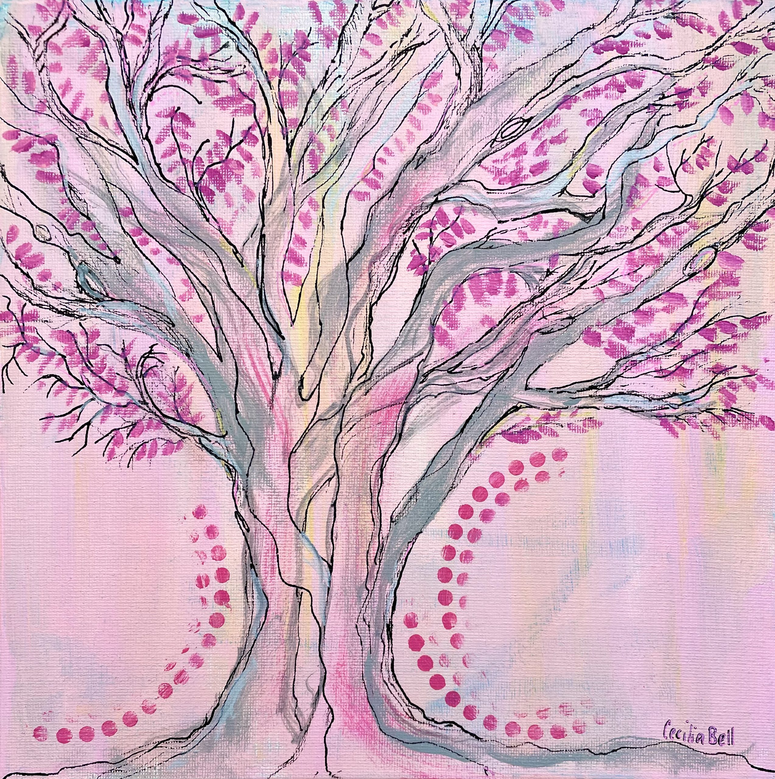 A whimsical magical colorful tree bursting with pink leaves. When a familiar thing, in this case a tree, is painted in unusual colours, it becomes a joyful escape from the everyday.