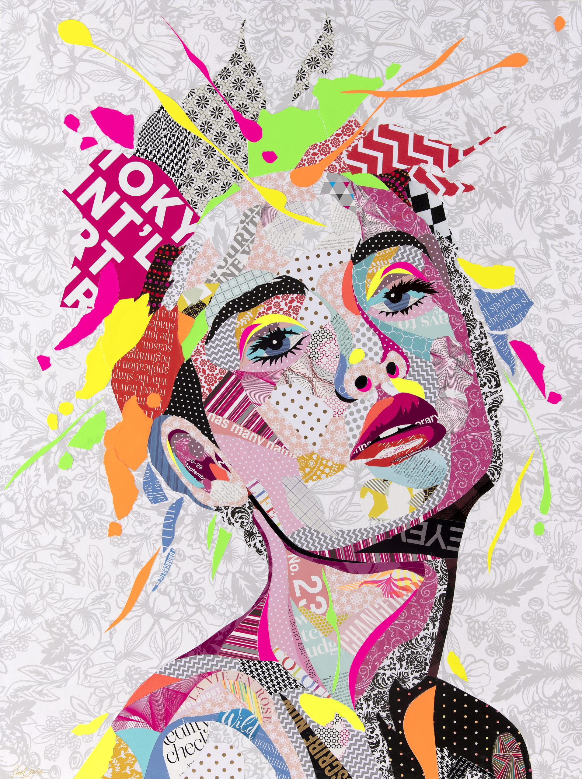 ‘Pretty in Pink Face’ uses patterned paper and type from magazines with splashes of fluro to give vibrancy and movement. A stunning piece that will be a hero in any room!