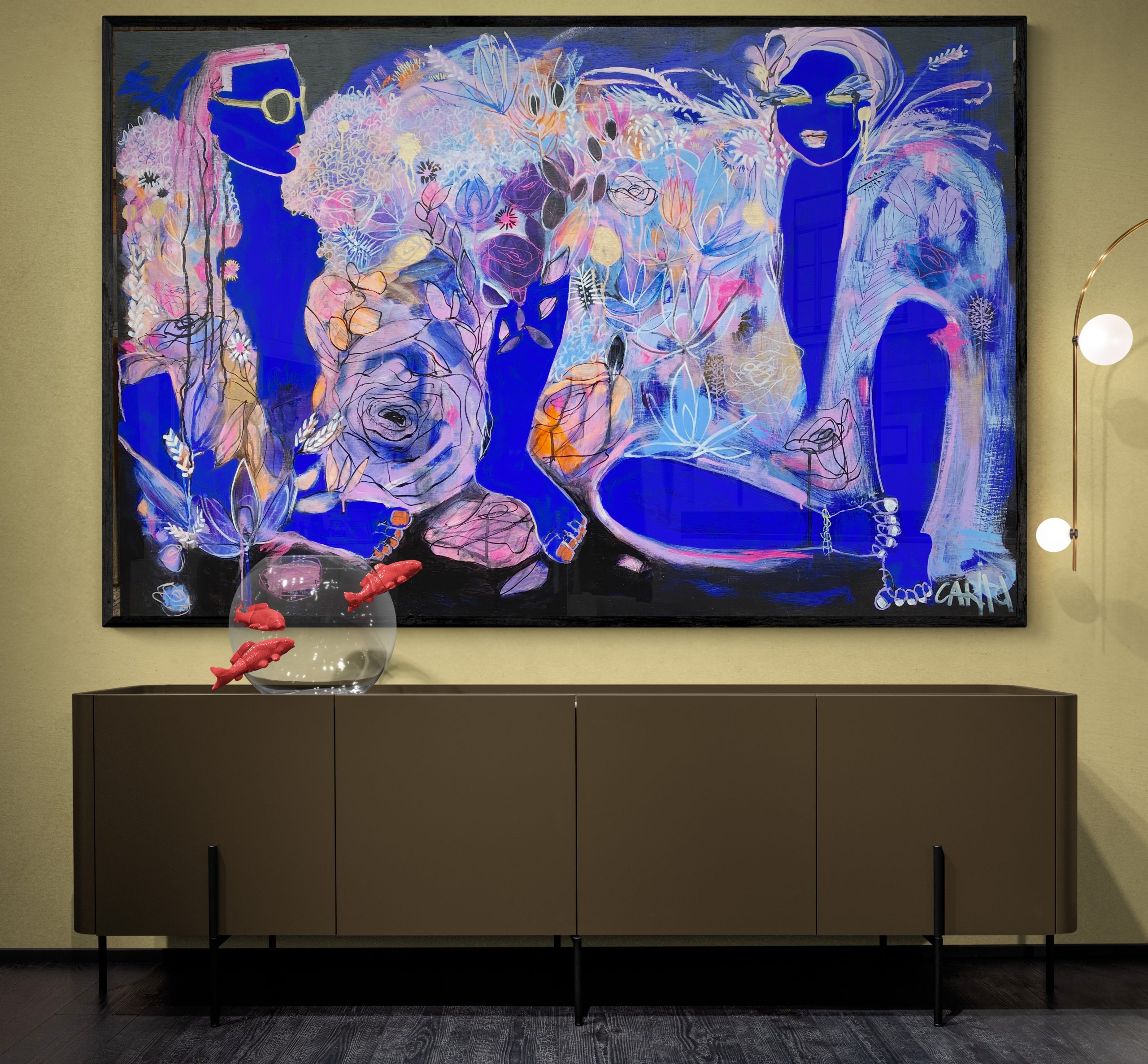 Acrylic on wood panel and framed in ebony stained oak