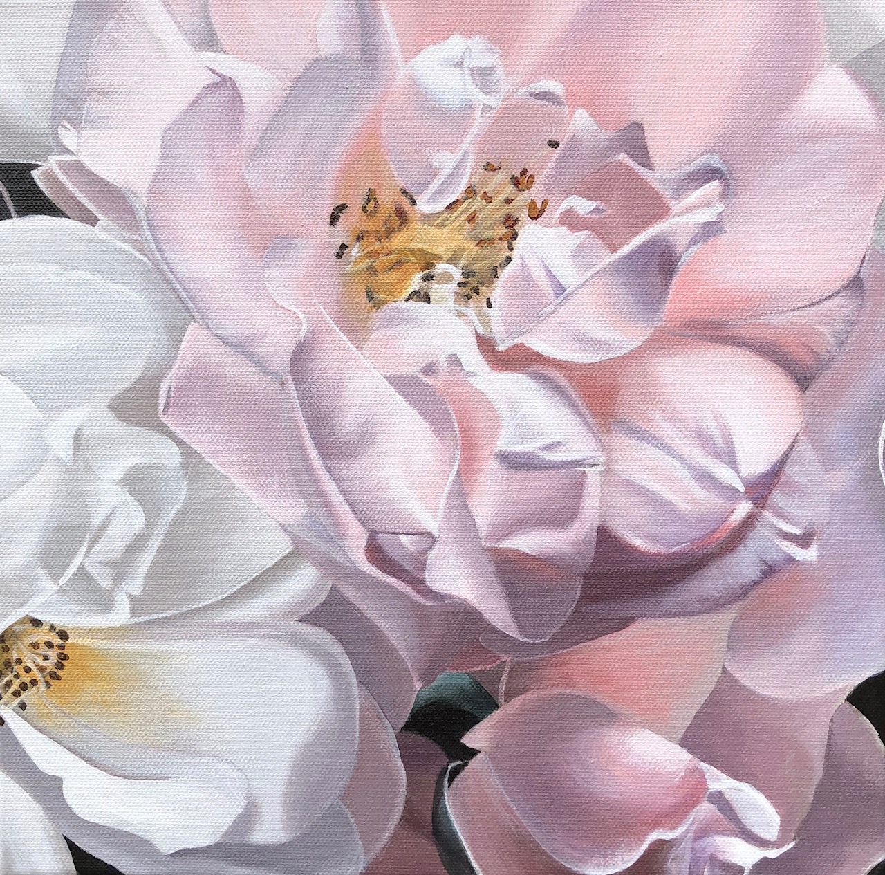 A small but very pretty close up view of a group of pink and white roses. The soft petals wrap around the edges of the canvas to give an almost 3D impression which also serves to make the painting appear larger than its petite size. The best quality acrylic paints were used and the canvas has been finished with a protective glaze. Reference material by Loretta @blooming_lovely_tamborinemount. This painting is ready to hang, however framing is an option for extra cost. Allow an extra $70 for a natural finish solid oak timber floating frame, plus 2 weeks framing time for this option.