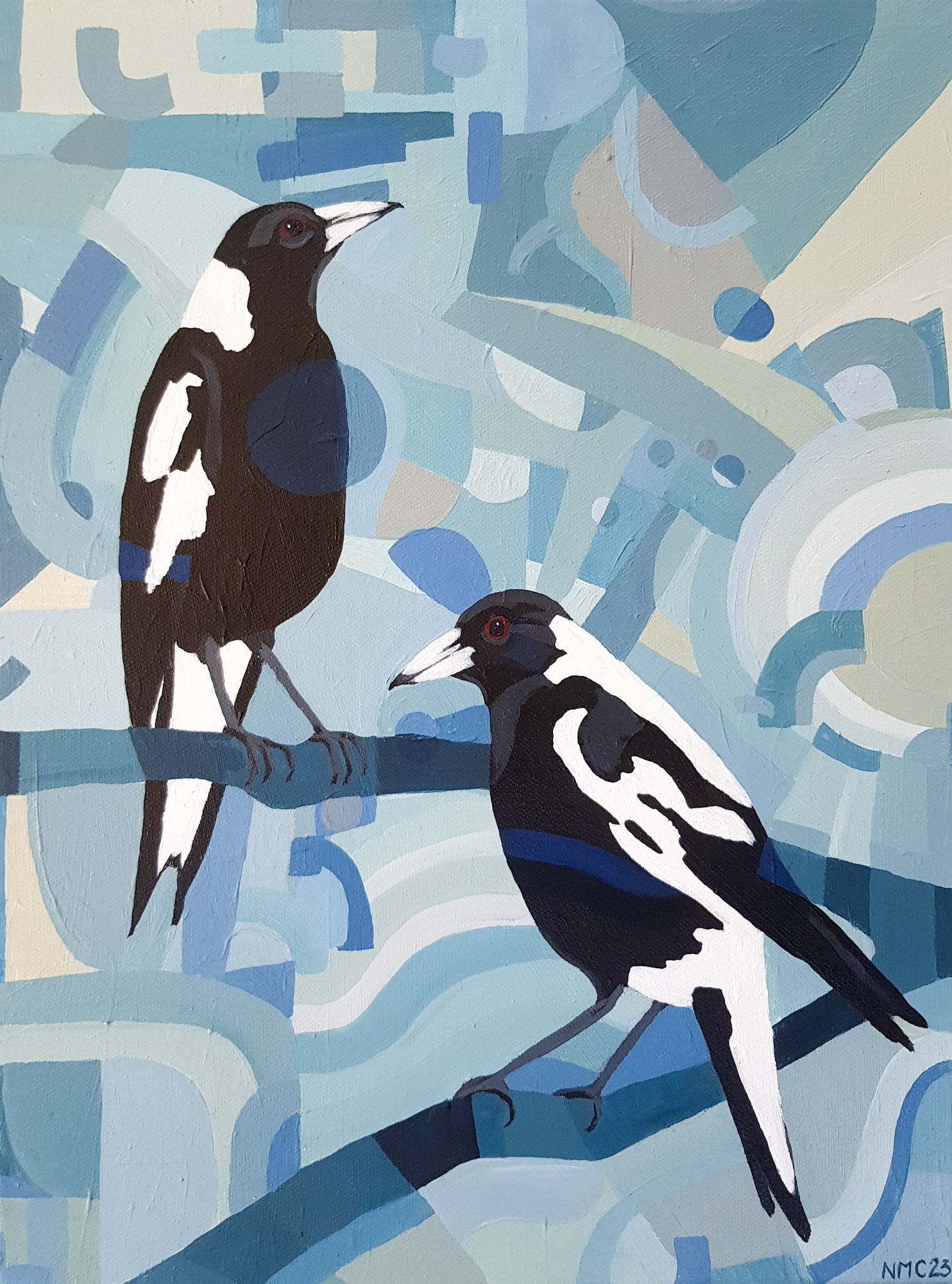 Painted with a limited palette of blues, black and white. The background of the painting is made up of abstract shapes and the magpies are stylized and made up of blocks of black and blue with their distinctive white markings and beautifully tonal beaks.