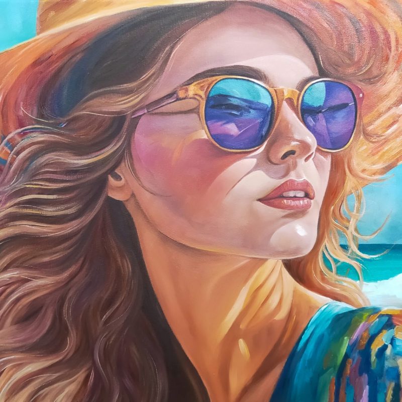 Carefully blended oil paint, with circular drips of white paint to suggest water ripples as the pebbles break the surface.