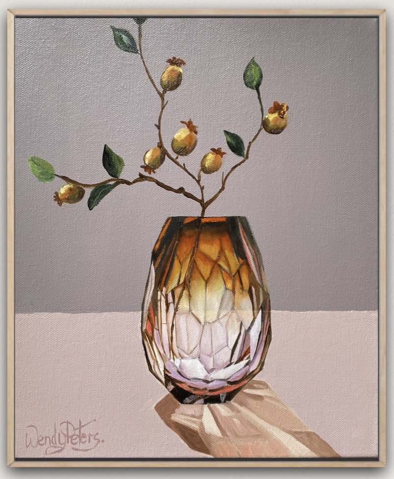 My love of painting glass continues. The play of light through the patterned glass vase adds a luminous quality, capturing light and shadow in the reflections make the vase gleam and creates intriguing shadows, which adds depth and drama to the painting, giving it a radiant glow, adding some simple but delicate flowers and buds keeps the focus on the vase but creates balance.