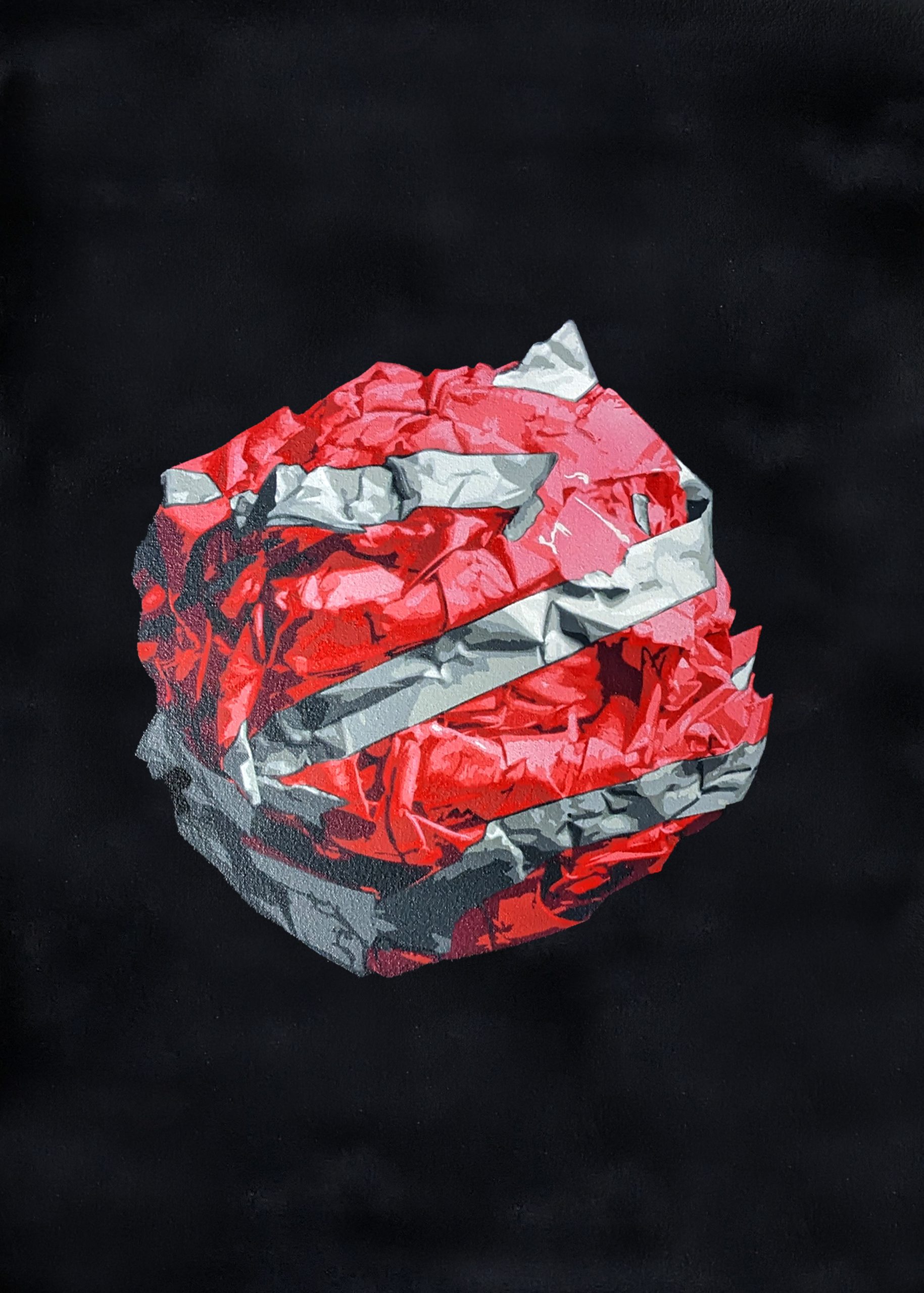 Bring bold sophistication and textural intrigue into your space with a key piece from my solo show “Wastelands” – a contemporary, large-scale stencil painting capturing the chaotic elegance of crumpled plastic sheeting, rendered with photorealistic precision in Red and white.