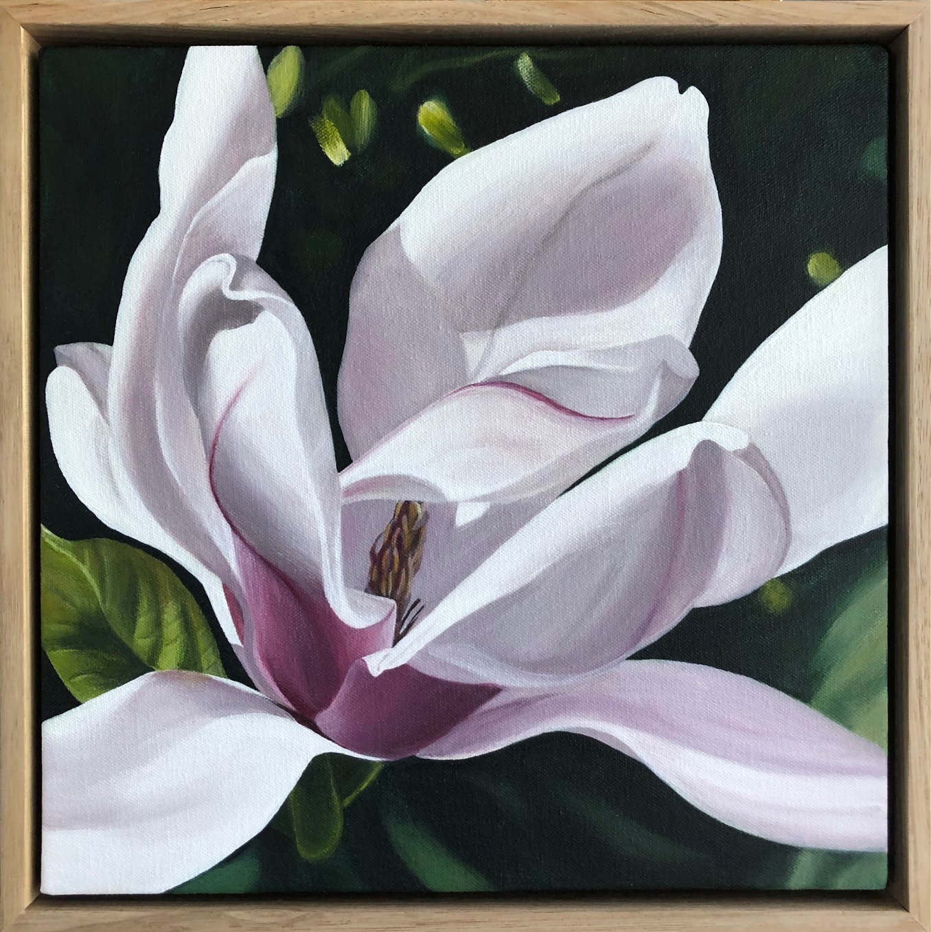 This painting is framed in natural oak and is ready to hang.