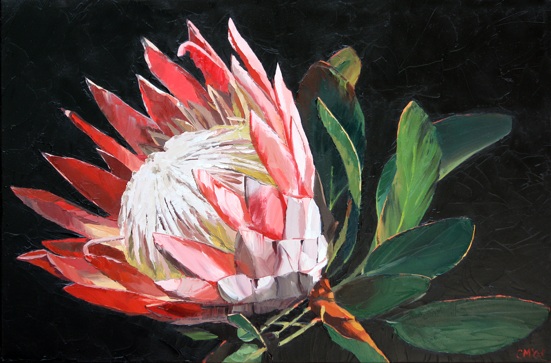 Protea by Claire McCall – The protea flower symbolise diversity, change and courage. This work highlights the bold geometric shapes and colours of the flower against a dramatic black background.