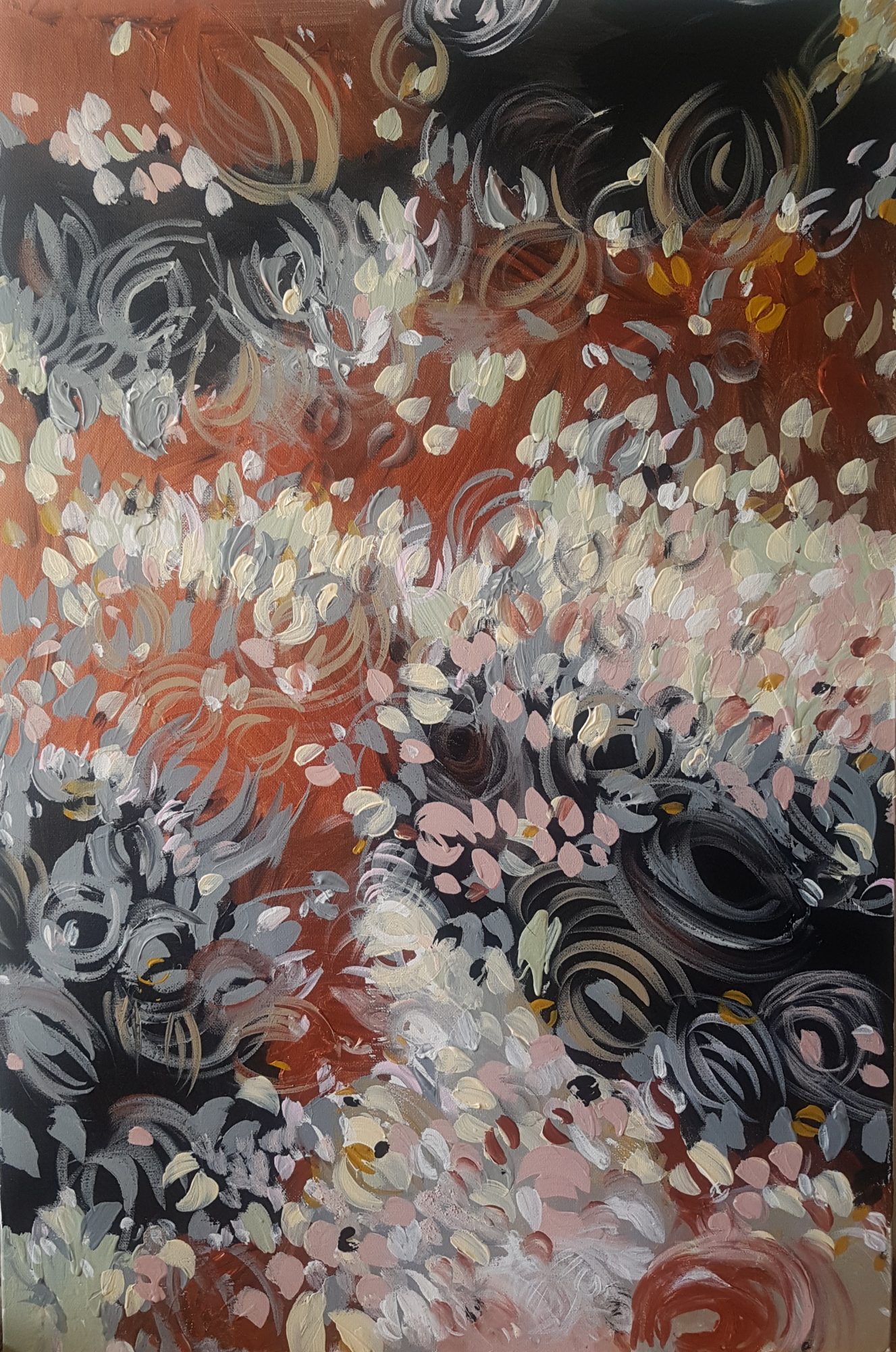 Protea Baby is a lively and pretty modern decorative abstract painting. It’s filled with expressive blooms, earthy colour, a sense of movement and hopefully a feeling of fun and joy. The enduring Protea with it’s types and colour variation is beautiful to observe and the main inspiration for this one.
