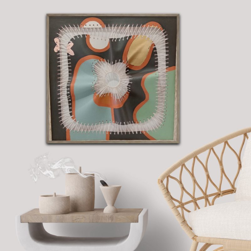 The work is a mixed medium painting and comes on a quality canvas and is painted black around the edges and is ready to hang as is.