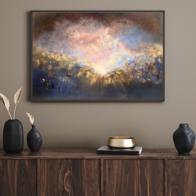 The work is a mixed medium painting and comes on a quality canvas and is painted black around the edges and is ready to hang as is.