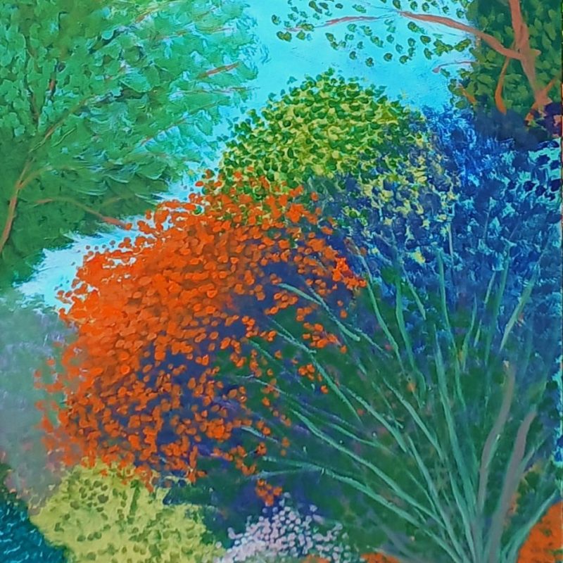 Proud as a peacock by Cathy Gilday – This brightly coloured and heavily textured painting is a semi abstracted look at the proud peacock in all its glory.