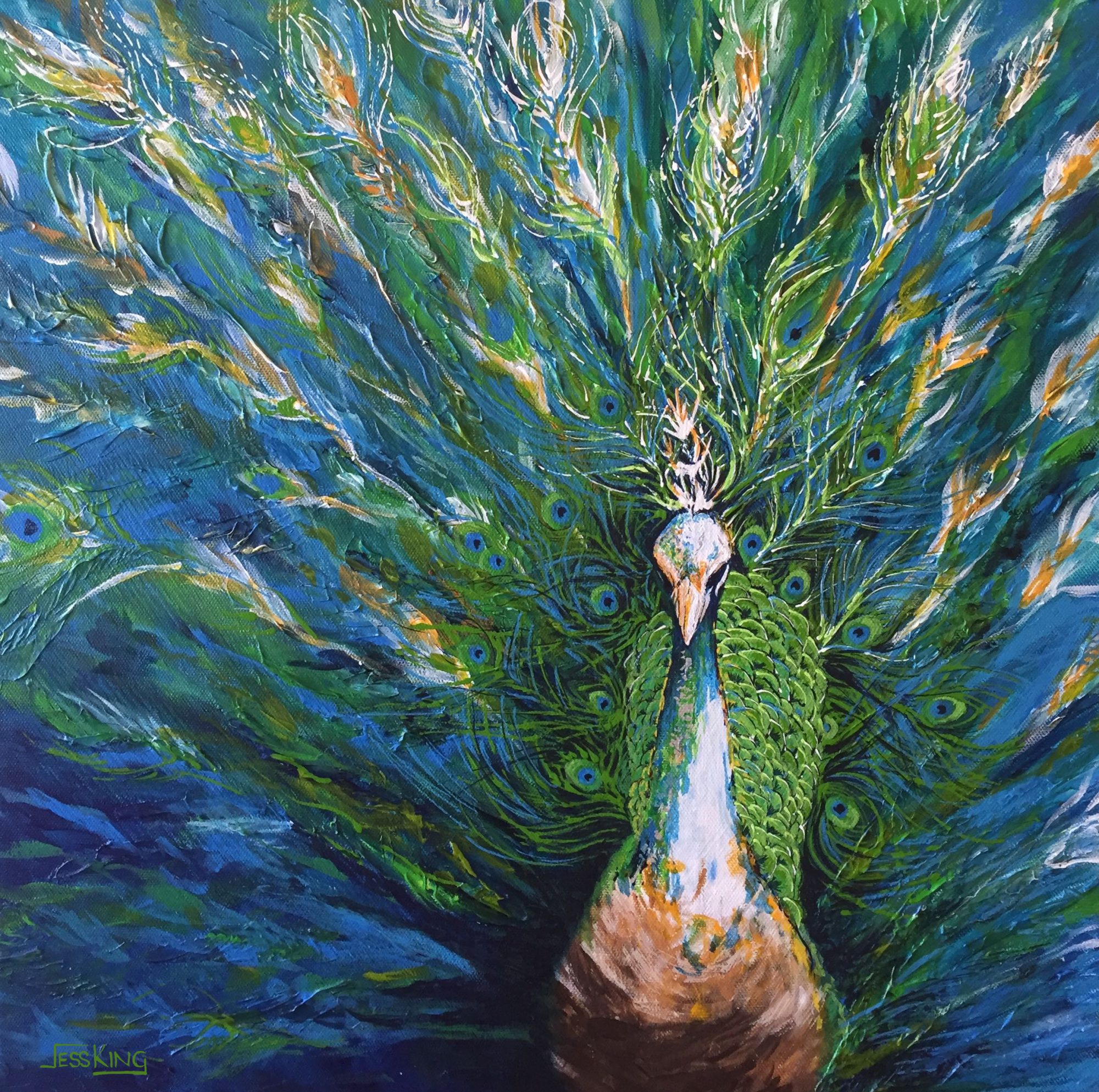 Another bird painting. I am fascinated with birds, so many species and all so uniquely beautiful. I find peacocks especially interesting with bright and shimmering feathers, especially when they puff their tail feathers. This proud peacock tail is slightly abstract with his tail feathers resembling birds of paradise.