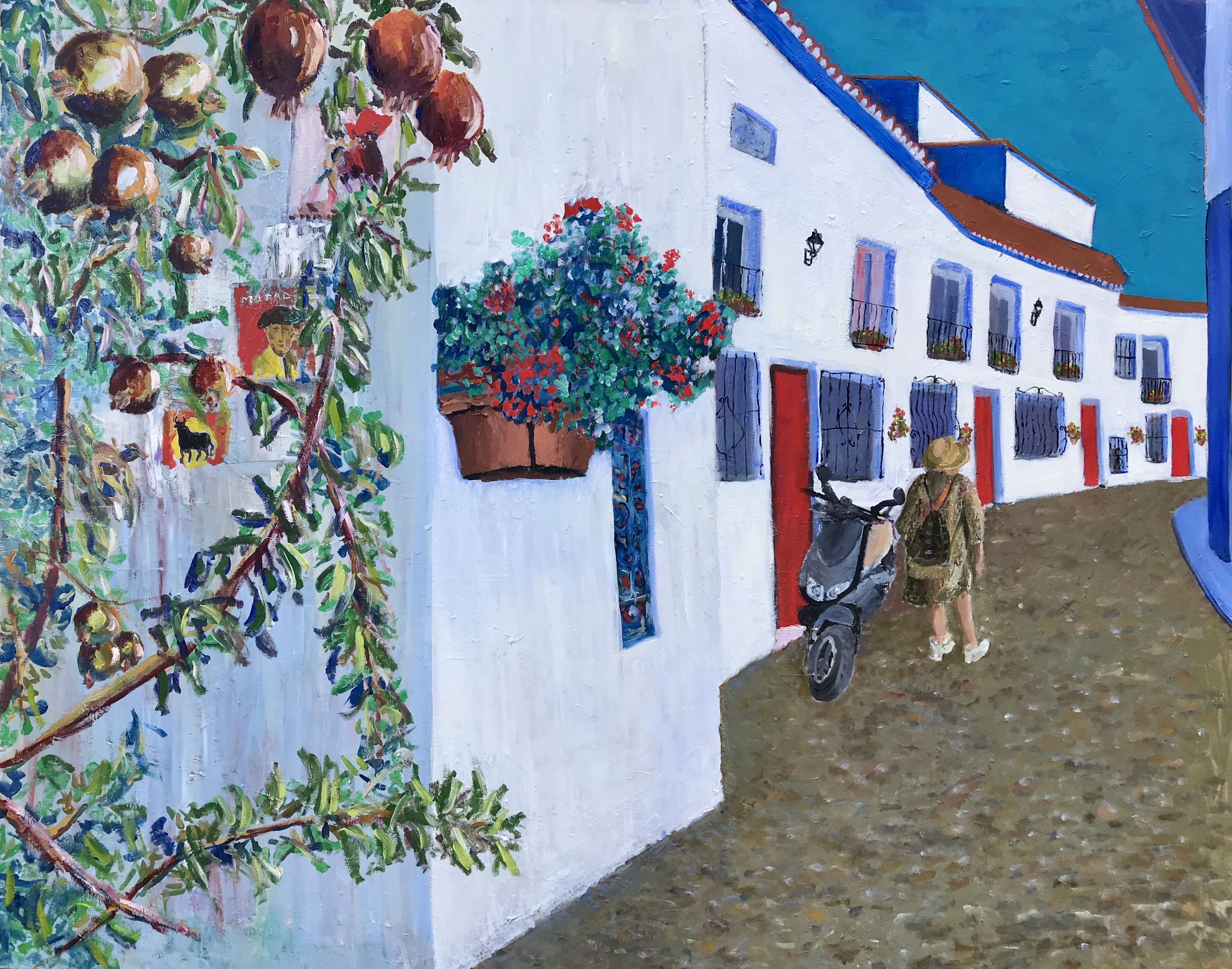 for instance, the Pomegranate tree was growing next to the remains of the towns wall, and several of the buildings in one street were used to base this painting. The red doors are my invention.