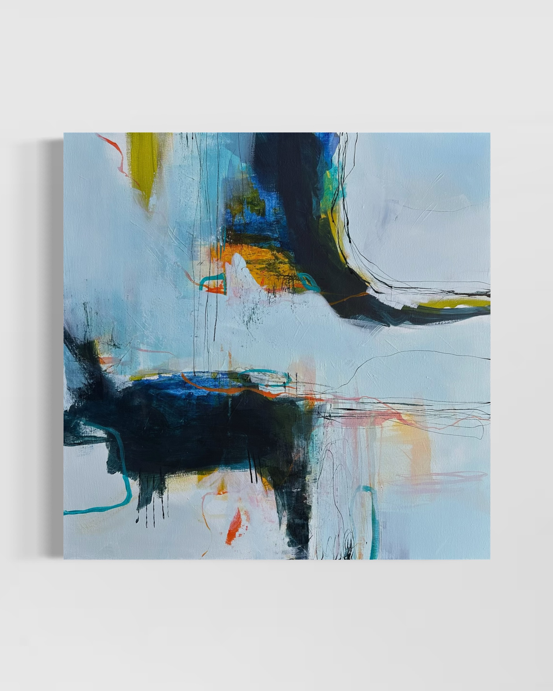 The first piece created after a period of rest, or creative block even, holds a special magic. This was true for me when creating this painting, as I was very free and without expectations, focusing on play and mark making. I love creating wonky lines with sticks dipped in ink, I love the tension between a strong value contrast and complimentary colours, in this case the orange and blue. All this adds to the emotional depth of the artwork.
