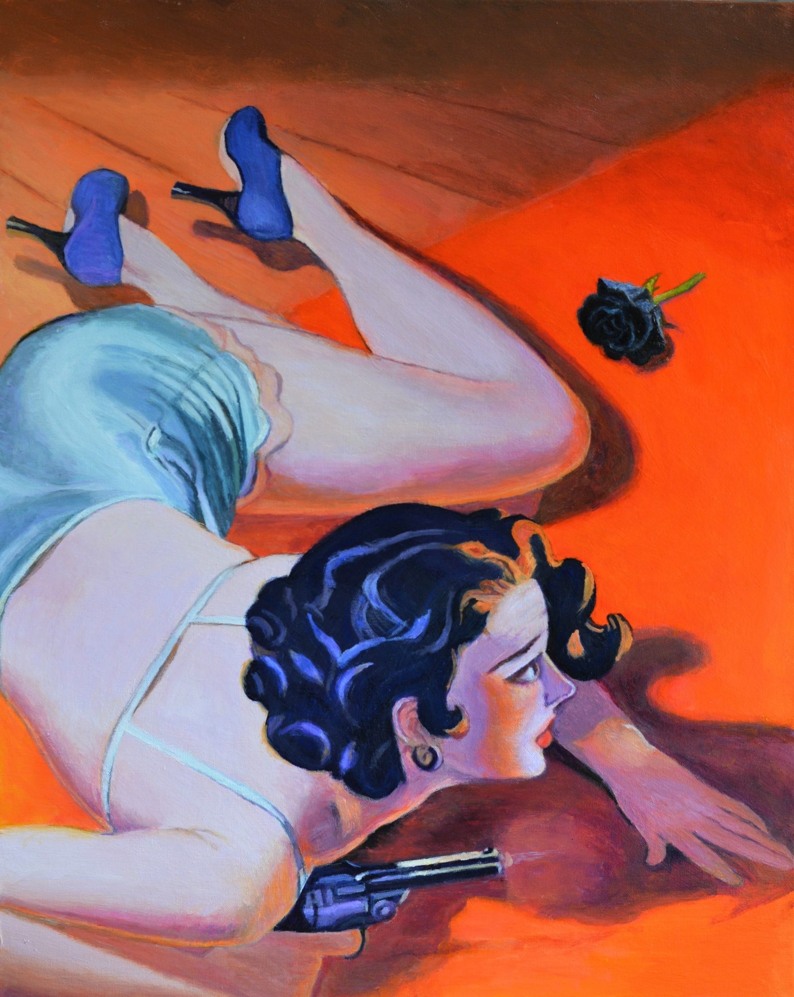 Snared – Original pulp art painting cover illustration art featuring a woman with a gun and black flower or rose who is snared by her pursuers, but will escape thanks to her handy gun – Noirscapes are Jane Ianniello paintings on high quality stretched canvas ready-to-hang with d-rings and picture wire and a solid pine frame.
