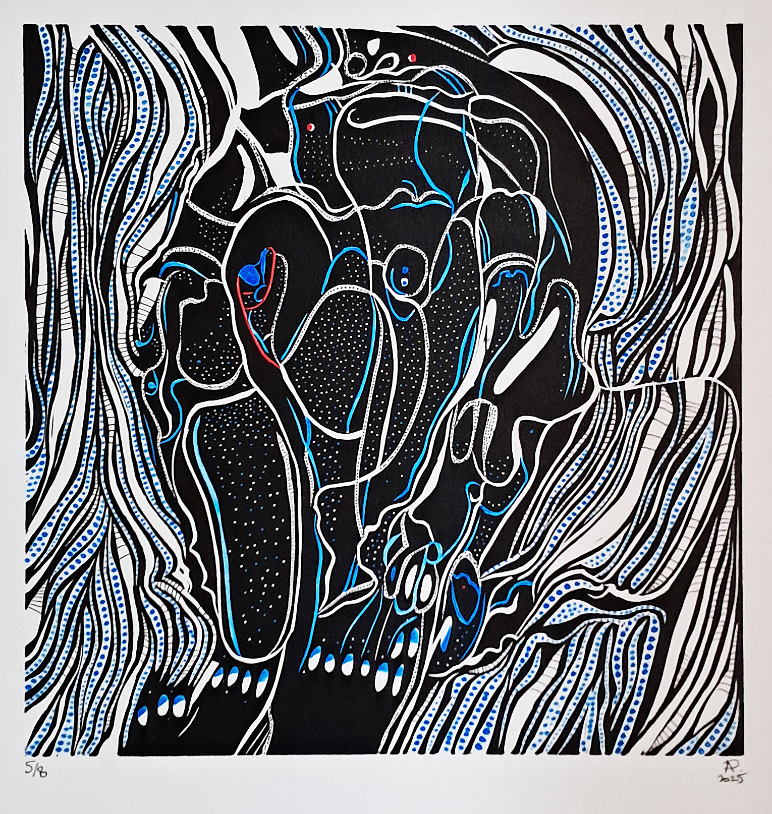 In this version, calm blue tones flow through the black-and-white structure like a current of oxygen and hope — the quiet breath of new life forming in darkness.