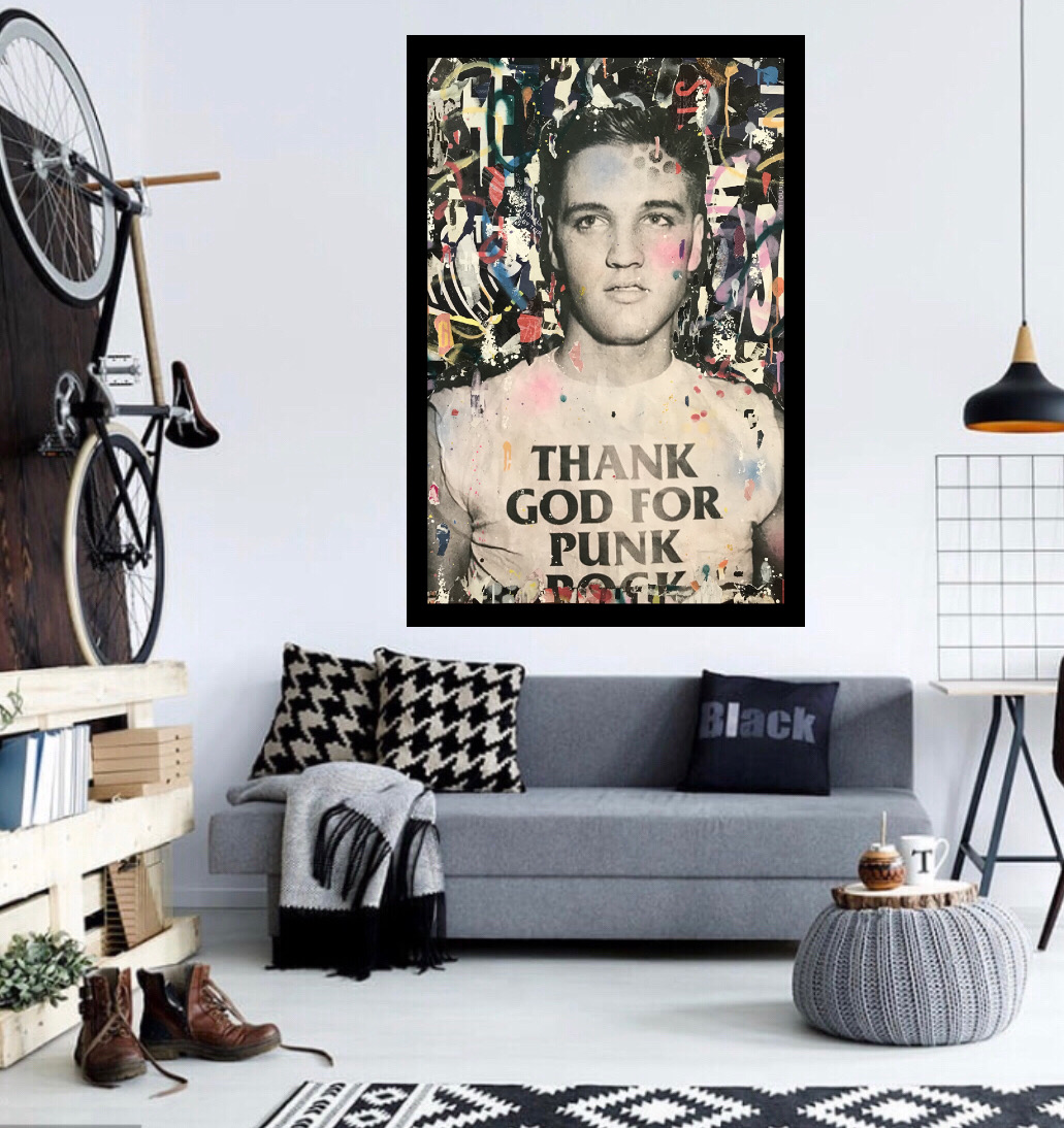 The main collage was built up with posters collected off the streets of Sydney & Melbourne. This background was then overlayed with Acrylic Paint, Sugar Spray Packs, Stencils & Paint Pens. Then the main Image of Music Icon Elvis was then overlaid and given a rustic appearance with further Paint and Paper.