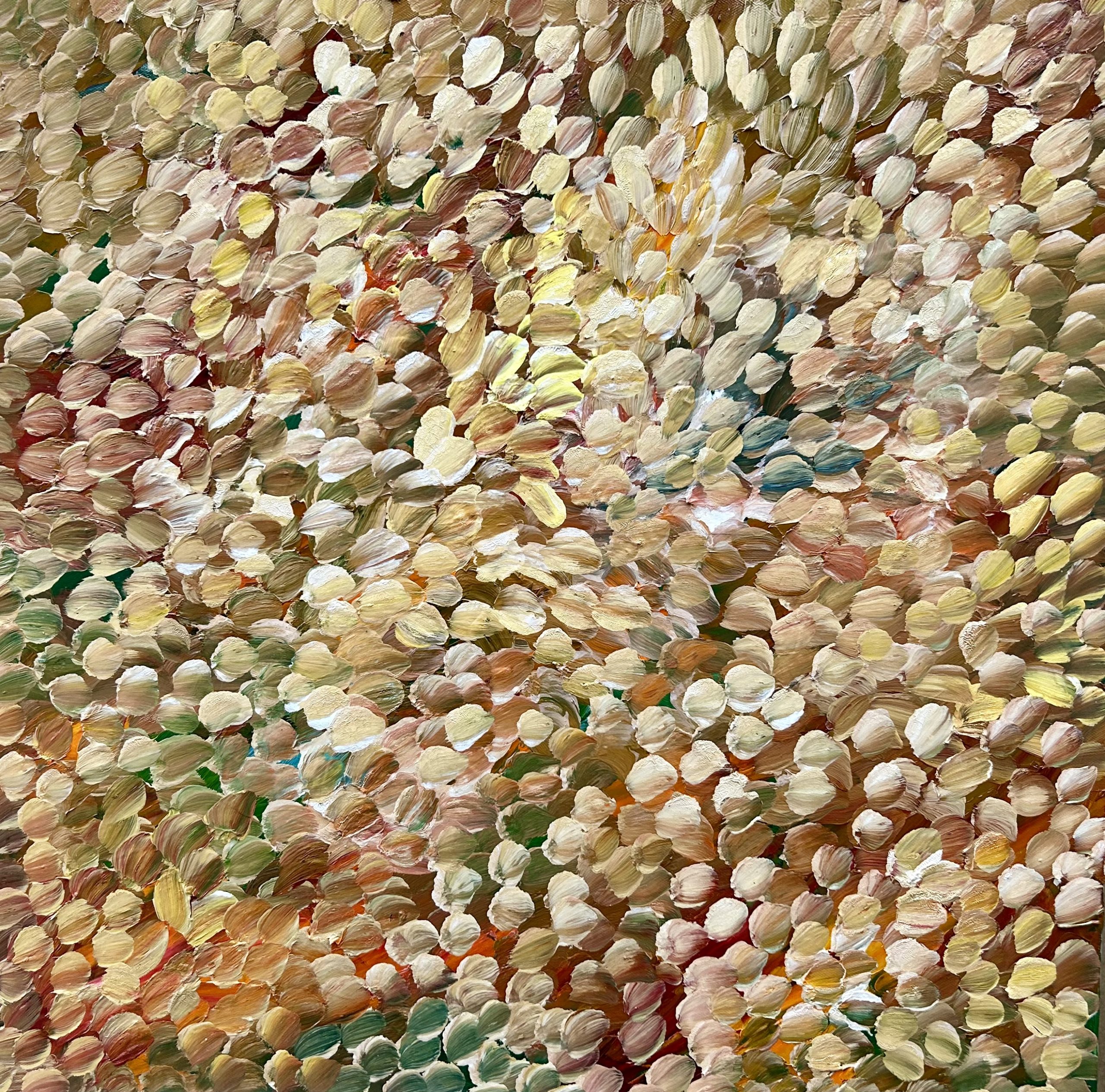 Pure Elegance by Theo Papathomas a painting with warm colours of petals flying in the wind creating this beautiful bouquet of petals over the landscape with lots of layers of oil paint. Petals weeping over the landscape creating so much movement and rhythms painted with a pallet knife and brush to create texture . A very peaceful and tranquil painting with so much depth. The painting does not come with an external frame.The painting is signed and dated at the back and comes with a certificate of Authenticity.