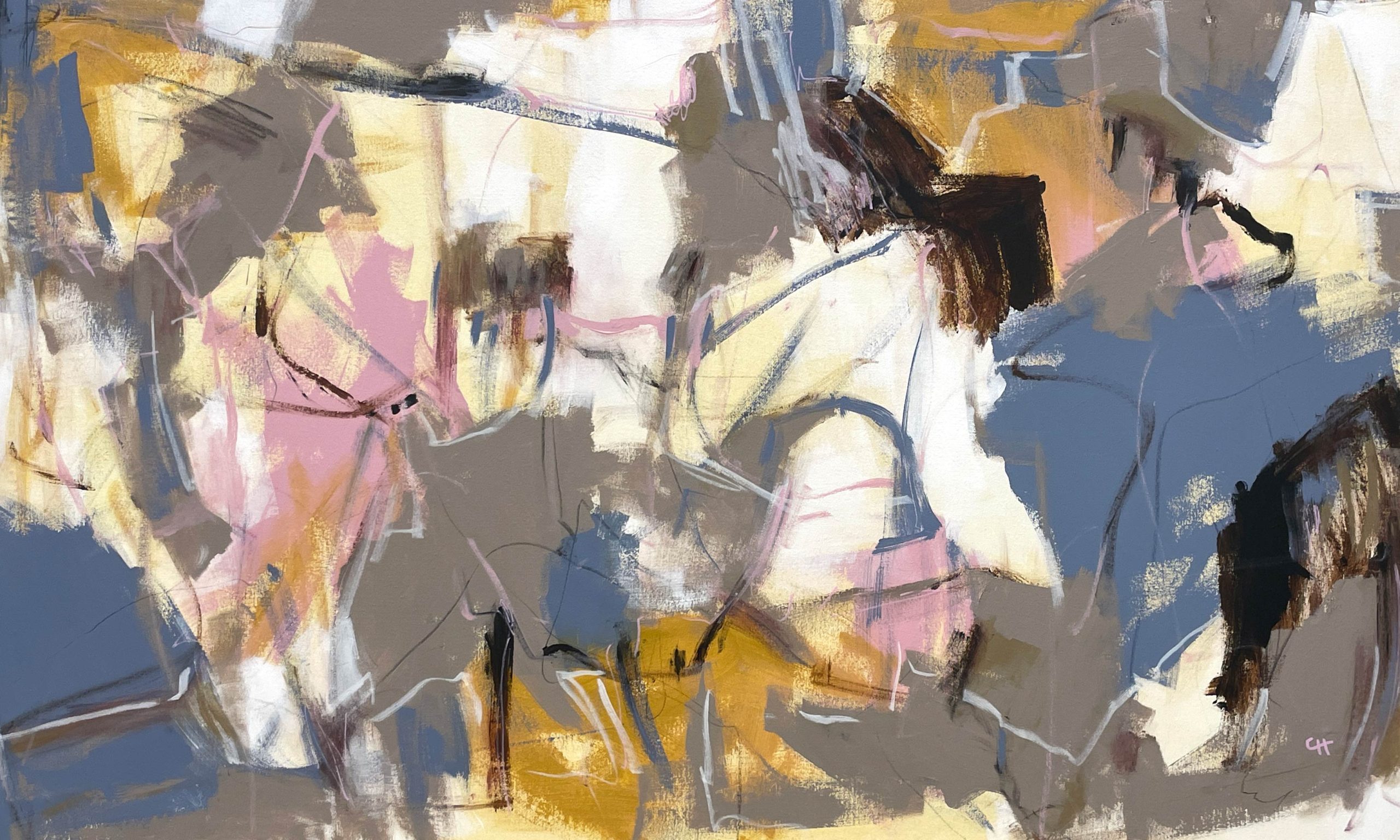 This striking statement piece was inspired by day dreaming across the mountains and sea to the horizon. The complex mark making combined with a beautifully balanced uplifting palette of blush pink and blue, ochre, mocha brown, lemon, yellow, grey, black, white and a hint of maroon.