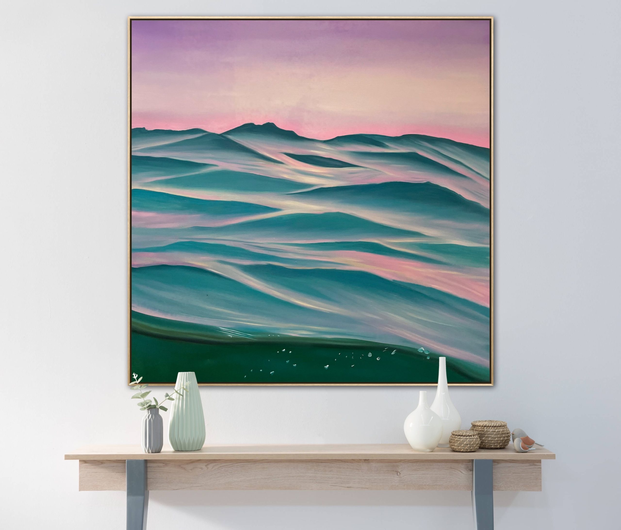 Its a special time swimming in water when the sun has dipped below the horizon turning the sky into a glowing purple, then underwater, the colour remains a beautiful green. This painting represents the tranquility, freedom and connecting entirely with nature while swimming in the sea.