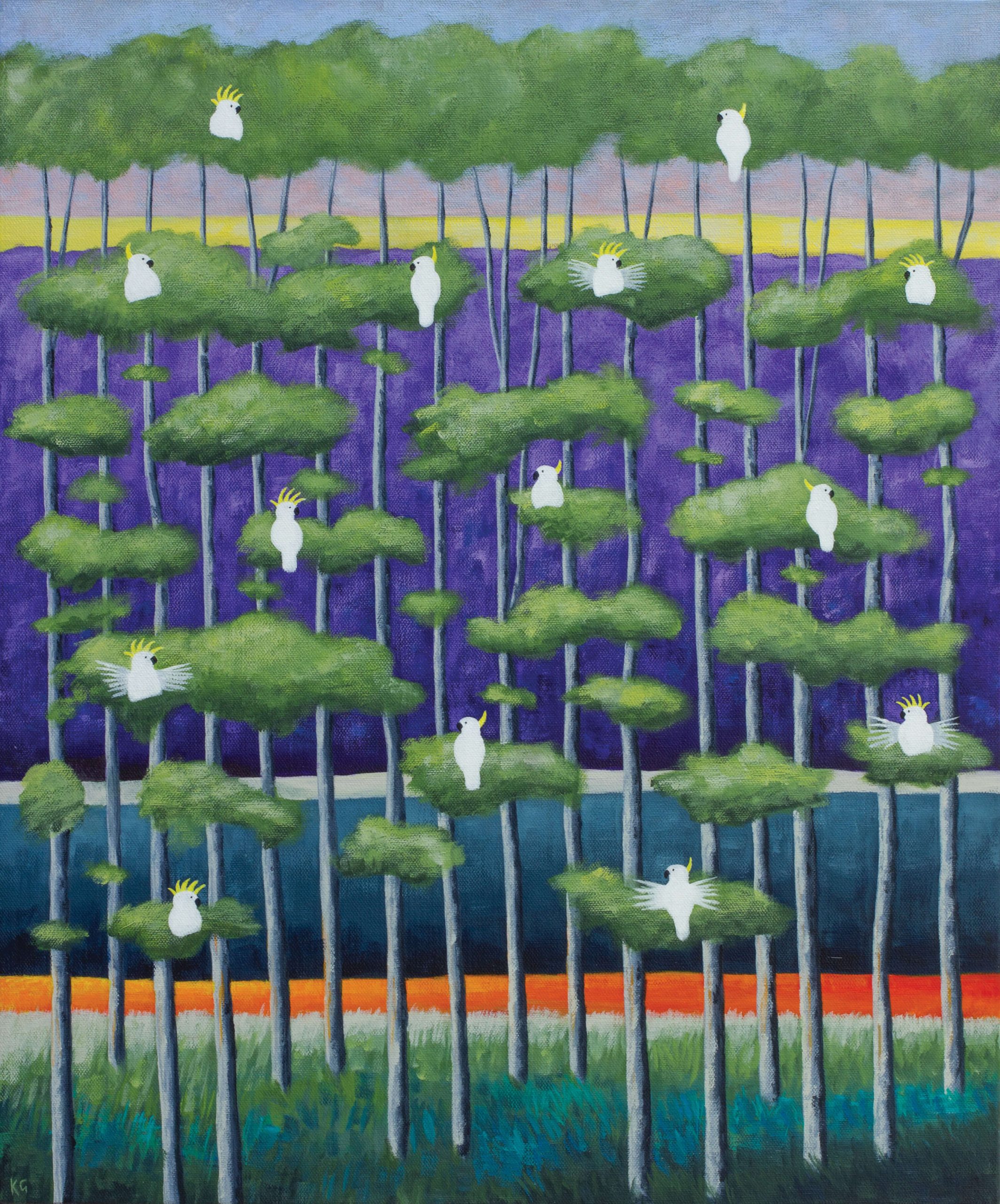 Purple Birch and Birds by Kate Graham. A forest scene in thick textured paint in coloured bands with the predominant colour of purple and highlights of striking orange and yellow. Add the flock of cheeky cockatoos that occupy the canvas with naive frivolity, this piece becomes a whimsical celebration of nature. Style is loose and painterly, giving it a textured charm that matches the naivety of the subject matter. Inspired by the colour field paintings of last century, the colour scheme