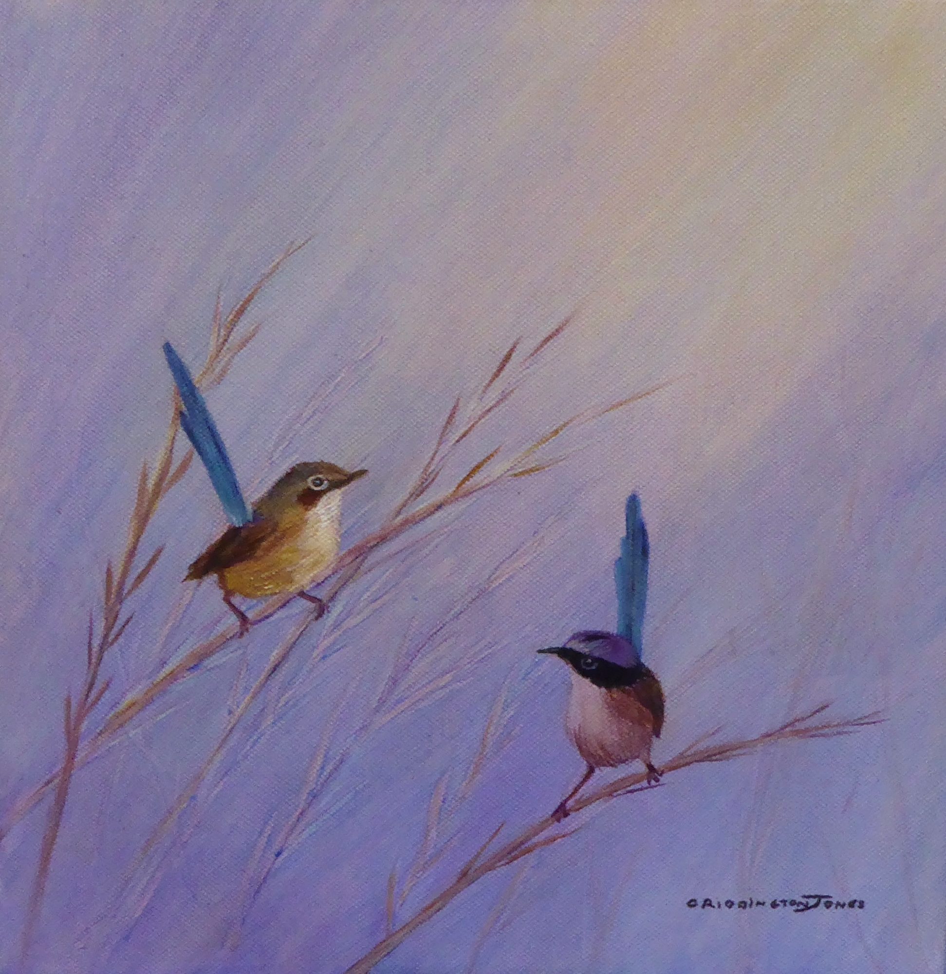 This little painting of Purple-Crowned Fairy-Wrens was inspired watching these tiny birds flitting amongst the grasses and chirping happily. It is on a quality canvas with a larger base than the top of the canvas. It can be stood on a table or console or hung on the wall.