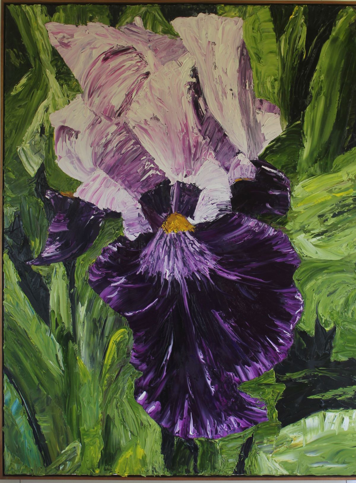 Purple daze is a pure oil impasto painted with palette knives leaving lots of texture and vibrant colours. It shows a purple bearded iris, Geek symbol of the rainbow. The painting has the perception of lots of movement whilst embodying the stillness of a still life.