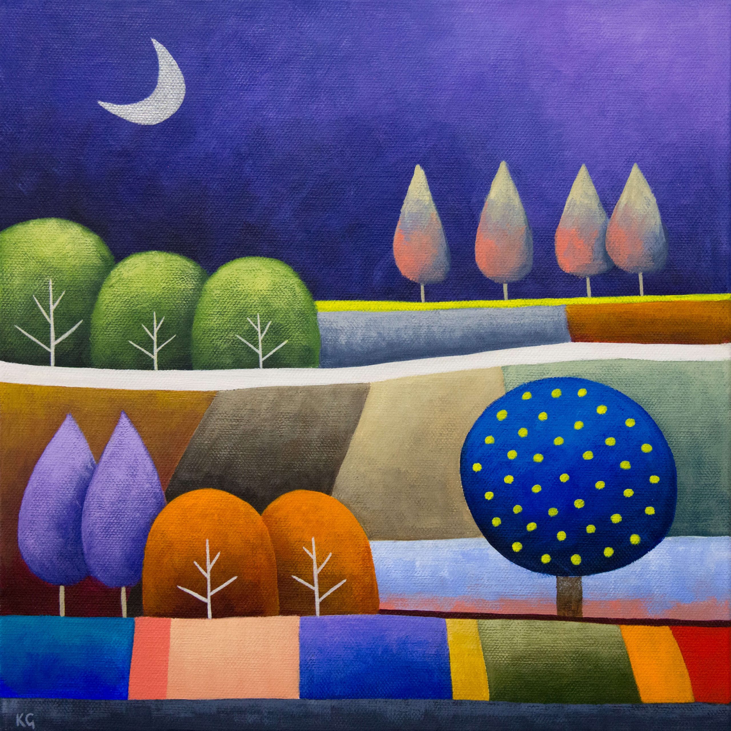 Purple Patchwork – Square by Kate Graham. This small nighttime landscape featuring a soaring purple sky, crescent moon painted with metallic silver paint, and a patchwork of fields interwoven with trees below. It is an almost surreal rural scene that celebrates colour and composition. Painted in a naive style to bring a sense of charm and delight, painted with dry-brush effect to give it a textured feel. This piece is part of the ‘Patchwork’ series where colours are woven together in a patchwork of harmony and sometimes disharmony. The flattened perspective gives the composition a naive and whimsical feel. The painting invites the viewer to see landscapes from another imaginative point of view. This piece would fit anywhere in a home or office, bedroom or living room, and is a great way to either start your art collection, or add a little touch of colour to your decor in limited spaces.