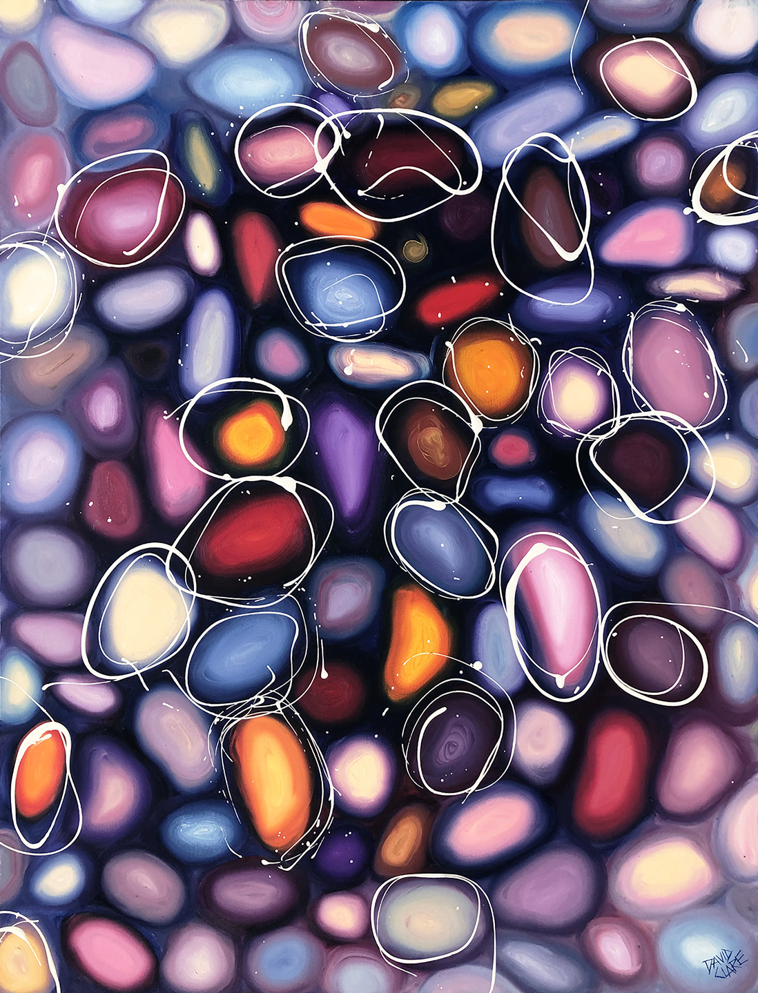 Another painting from my new series inspired by coloured pebbles in a shallow stream. The Pebbles are created by carefully blending rich oil colours, then pure white paint is dripped randomly to suggest water ripples as the pebbles break the surface of the water.