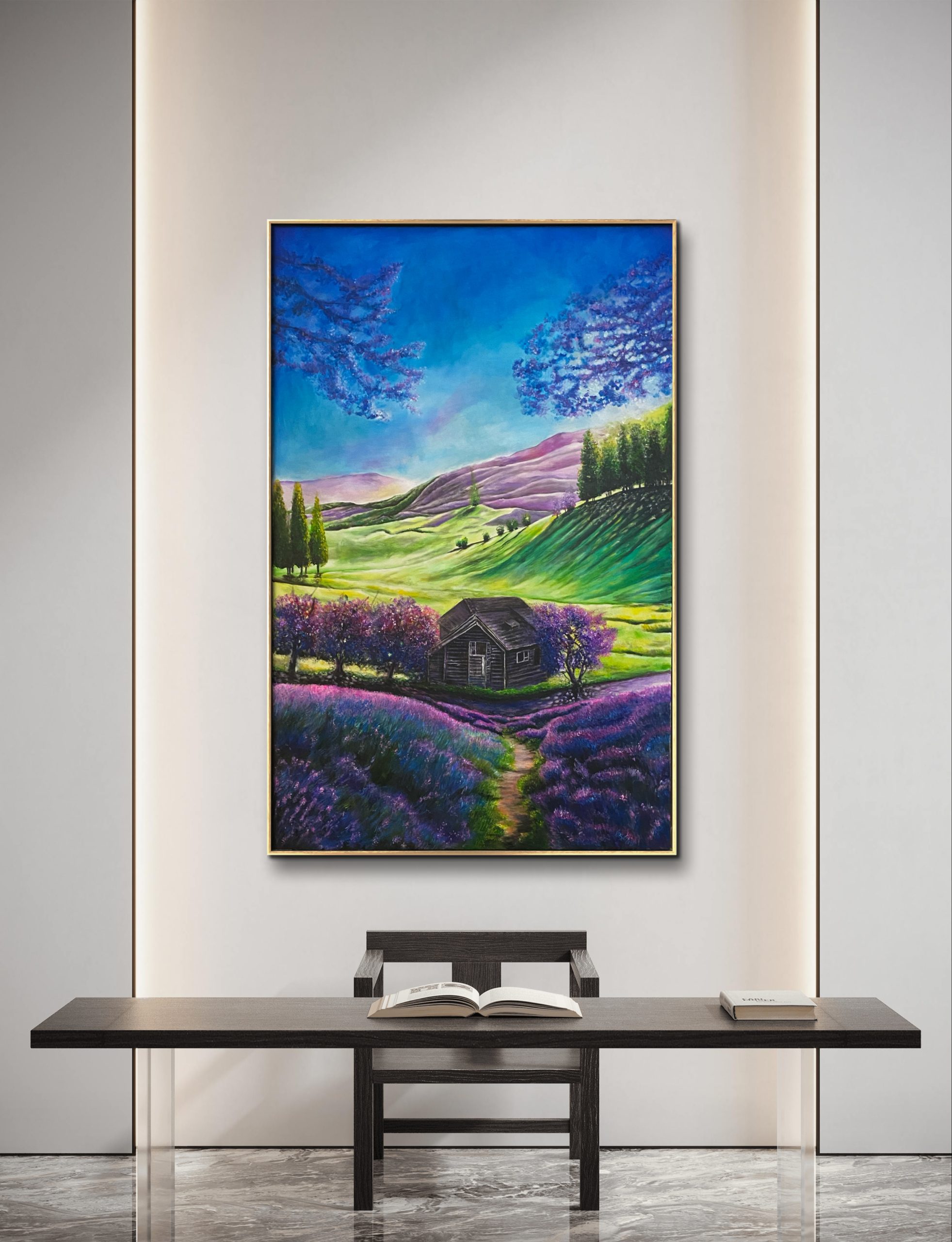 Purple Valley by Mahesh Aluthge – Spectacular view of the magnifient purple, magenta and lavender colors spreaded all over the valley The view shows the view on a typical sunny day with shadows. its a vertical painting (1000X1500mm) and would suit any of your room or living area specially with a vertical space.