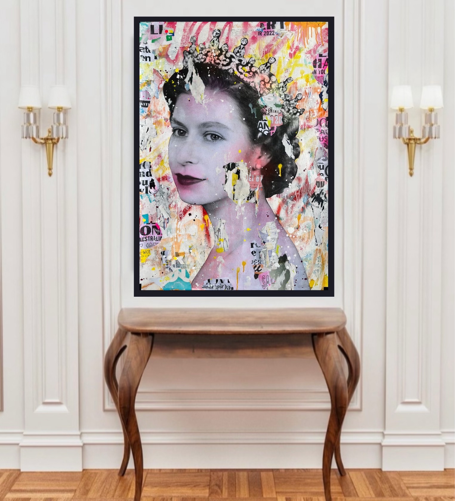 The main Image of on The Queen  was then added and then further overlaid with layers of paint and street posters to give a worn rustic appearance.