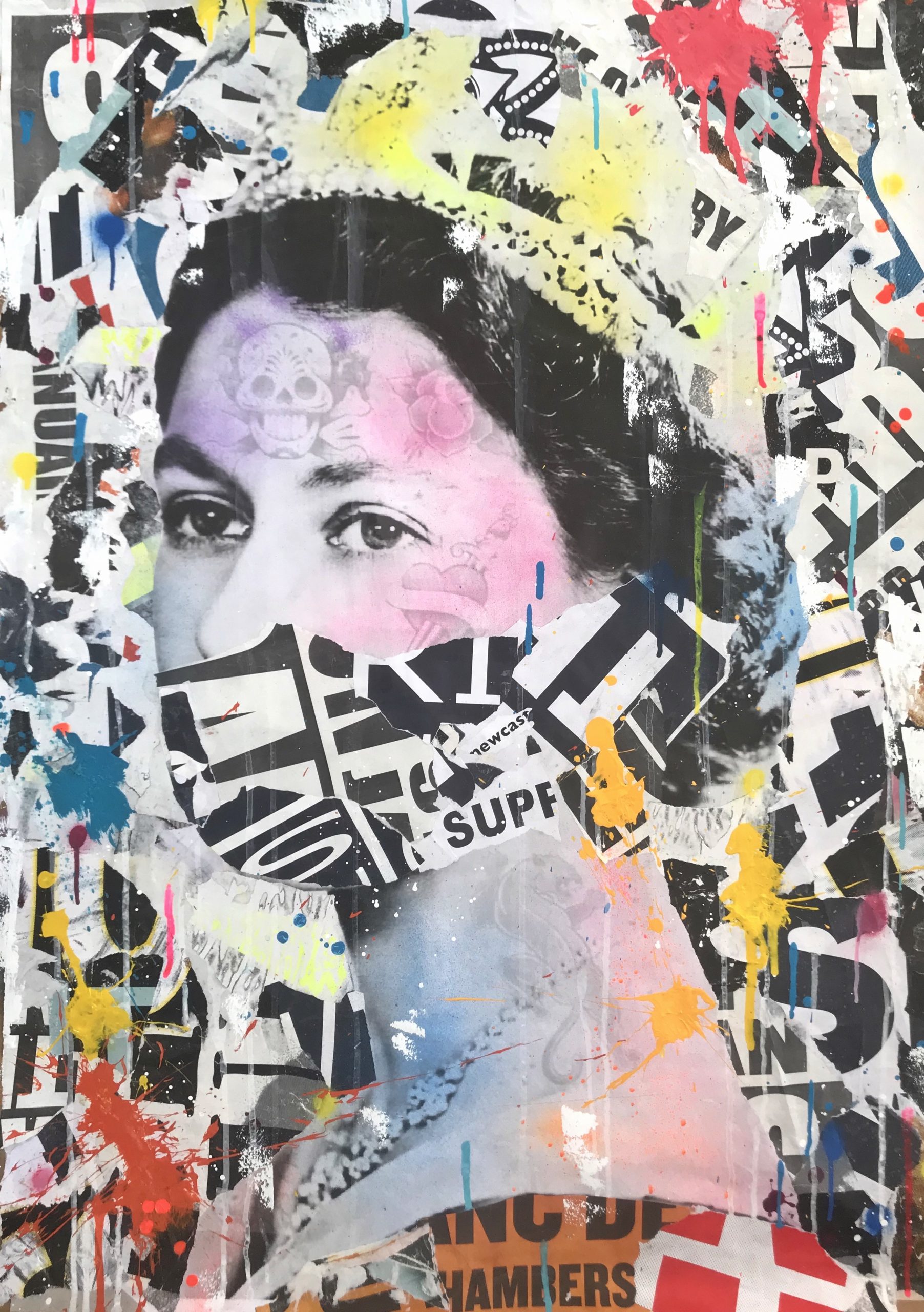 This artwork has a textured finish created by built up layers, paint splatters and torn paper, a visual effect mimicking the look you would see in the street where this effect is created over time. These imperfections are part of the overall look and feel of the finished work.