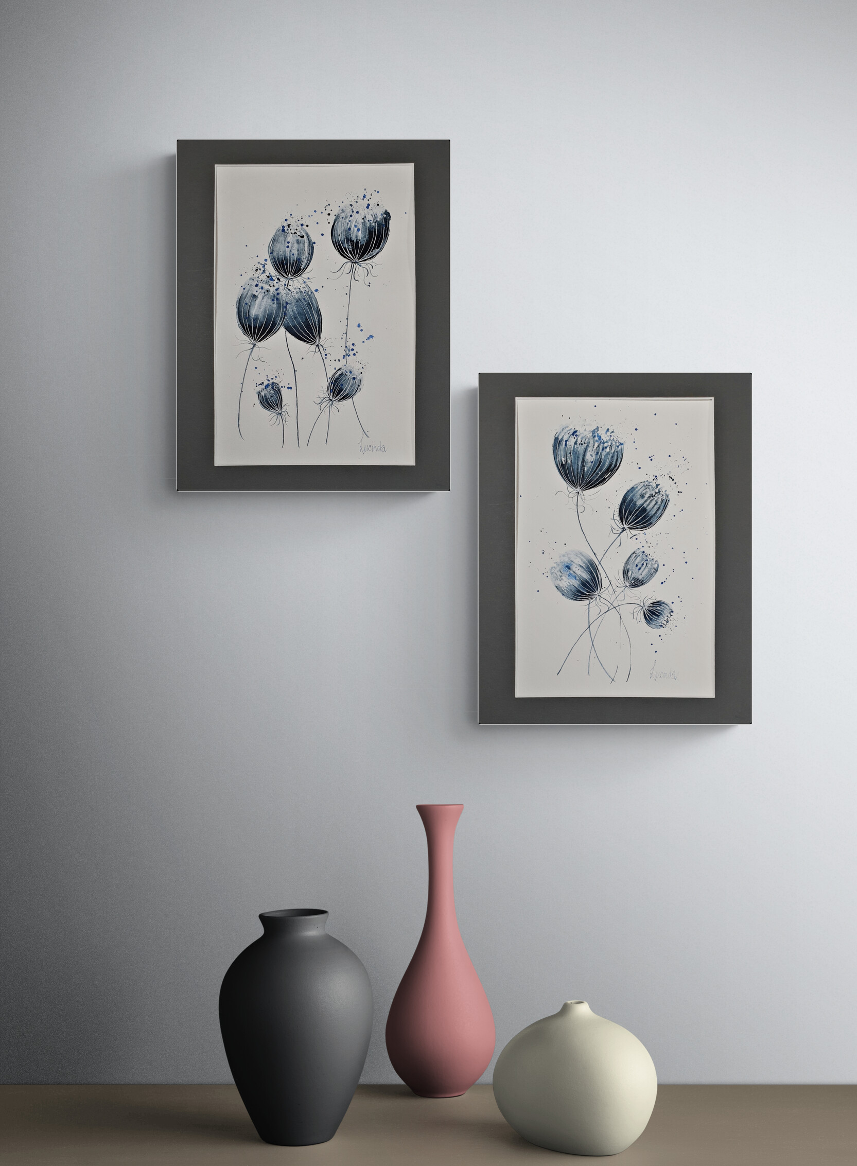 Queen Annes by Lucinda Leveille – Â is a pair of watercolours playing with ink and watercolour and finished with a fine white line ink.