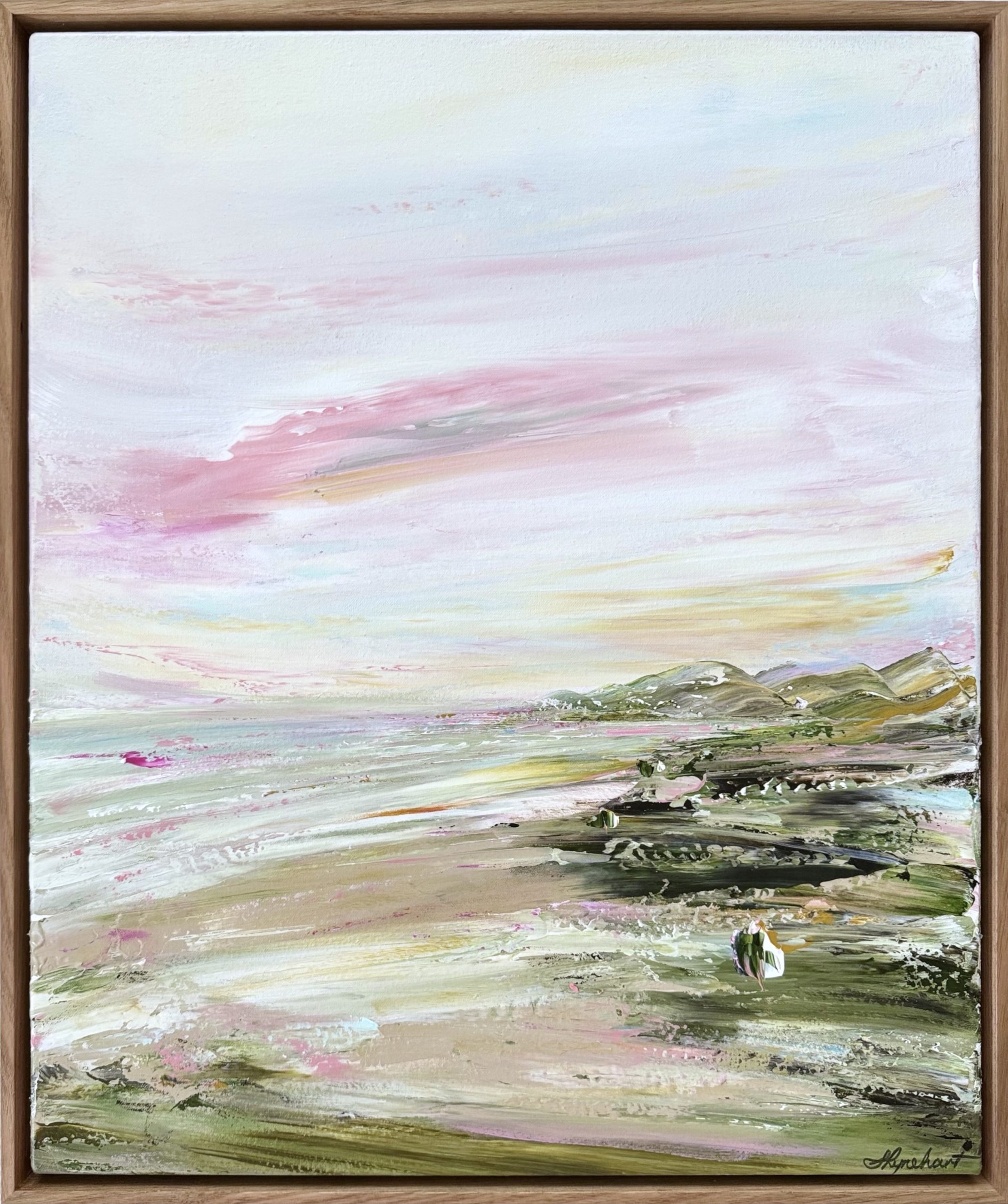 Created with palette knives on 12 oz stretched cotton canvas, this beautifully soft and quiet coastal landscape has been framed in a solid oak timber frame. It is satin varnished, and comes with a COA.