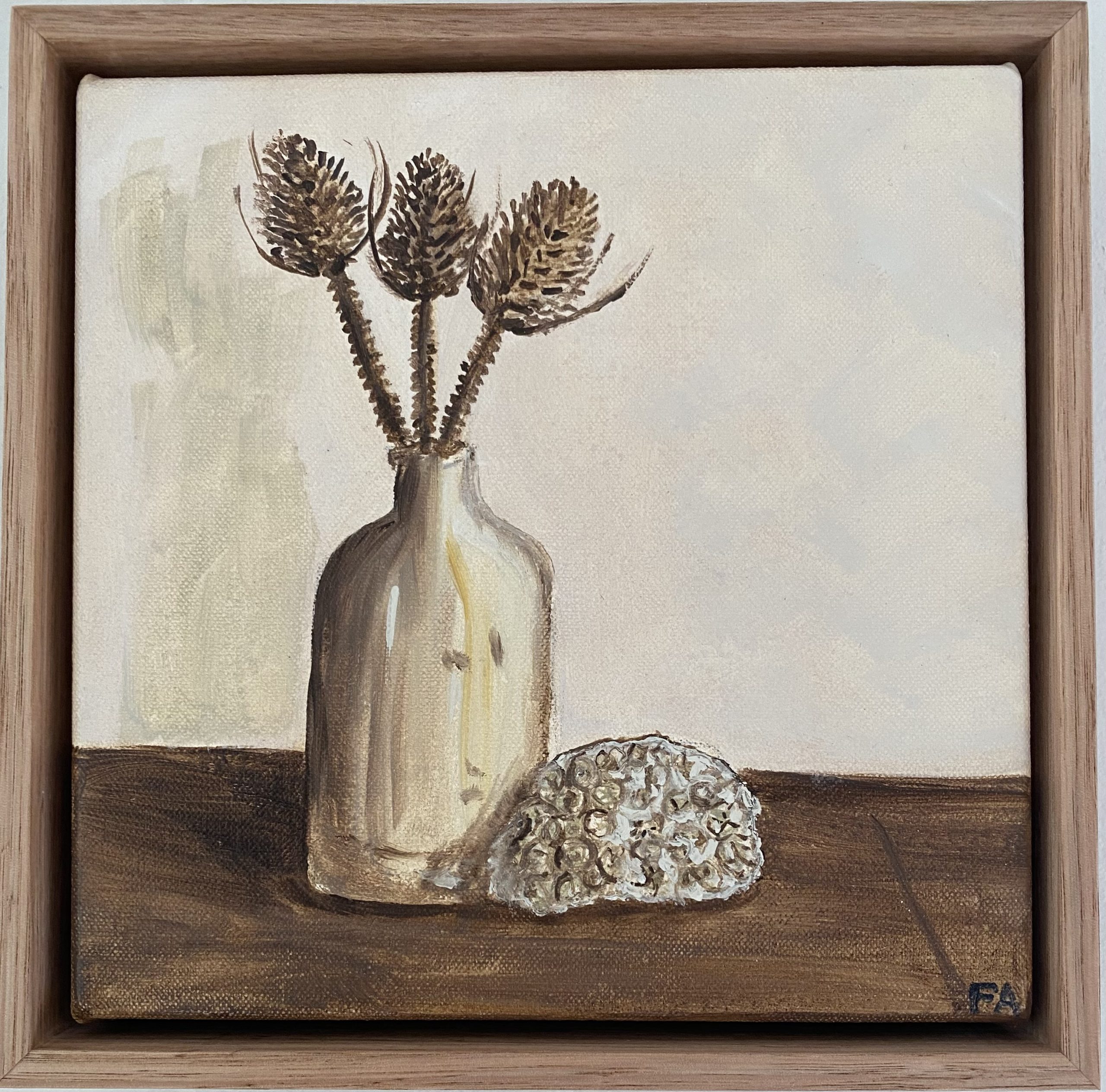 Quiet Teasel and Coral by Fiona Allison – I love everything about vintage ceramic vessels and dried teasel always has such a beautiful natural form. Coral completes the simple marriage of both country and ocean in this piece. I wanted the palette to be calm and serene⦠and neutrals work so beautifully in any room. I hope to give the viewer an opportunity to rest the eyes and relax the soul. Ready to hang with wire and d-rings,