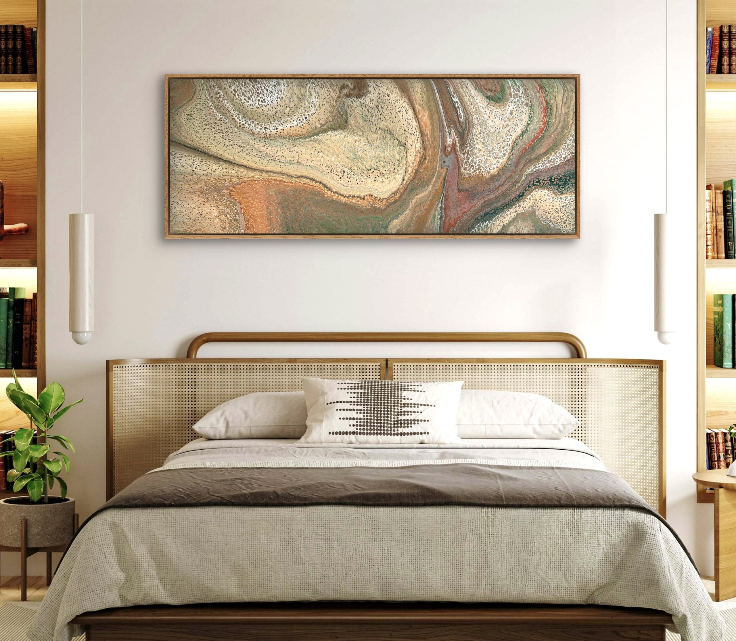 This piece was created using a blend of fluid techniques that encourage the flow, interaction, and separation of colours. Rich earthy tones of sandstone, clay, ochre, soft sage, metallic copper, ivory, and charcoal grey drift across the canvas in layered patterns, while subtle hints of green and burnt coral emerge from beneath the surface. This natural movement gives rise to fine lace-like cells and intricate textures, forming an organic composition that feels both grounded and expressive.