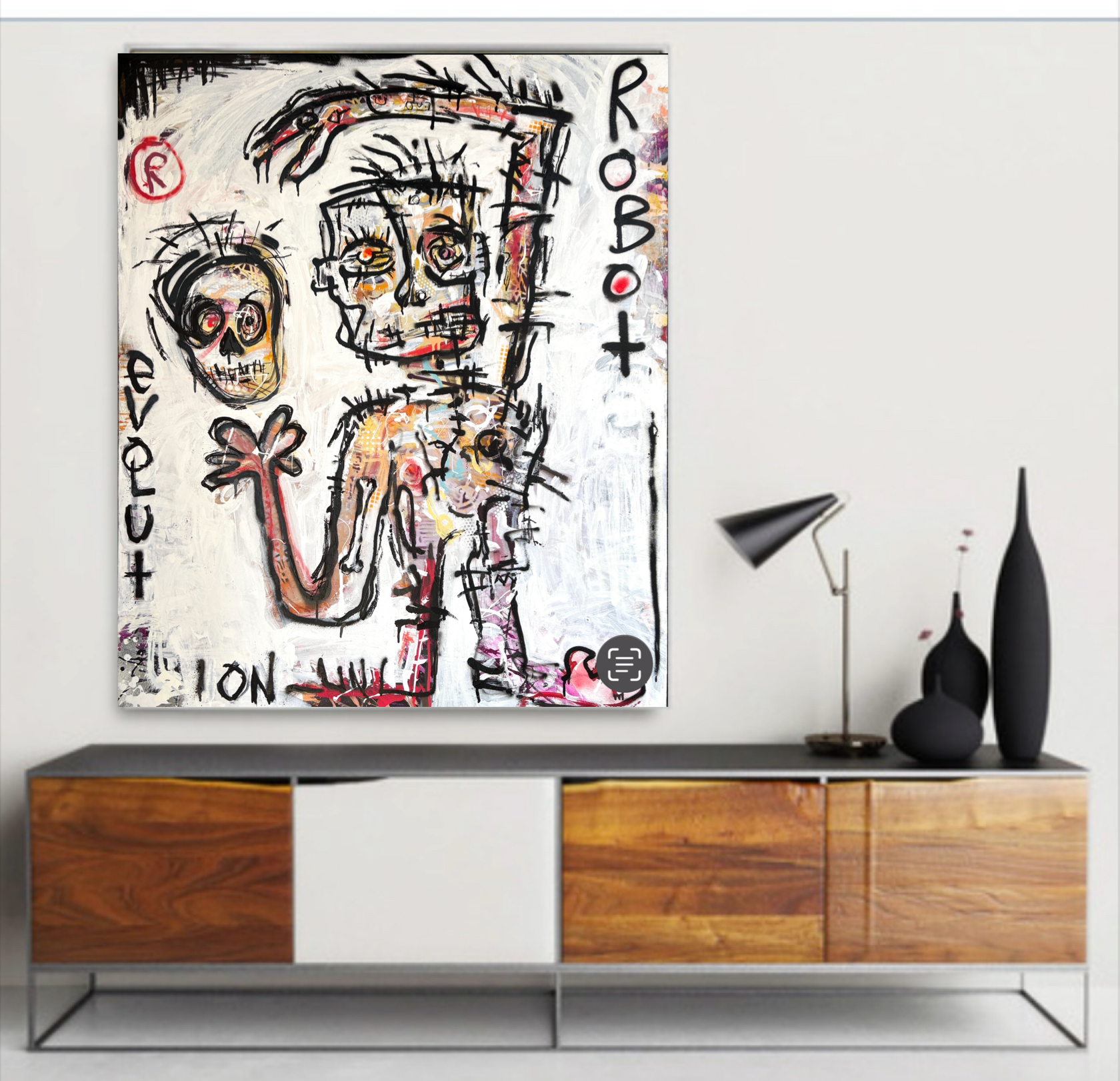 Al – ‘ColdGhosts contemporary mixed media artworks explore the evolving relationship between humanity, technology, and consciousness. Fusing visual storytelling with traditional paint techniques GhostArt creates thought-provoking artwork centered around robots and artificial intelligence. His pieces often reflect on the blurred boundaries between the organic and the synthetic, examining how Al mirrors, disrupts, or even redefines what it is to be human’ ..