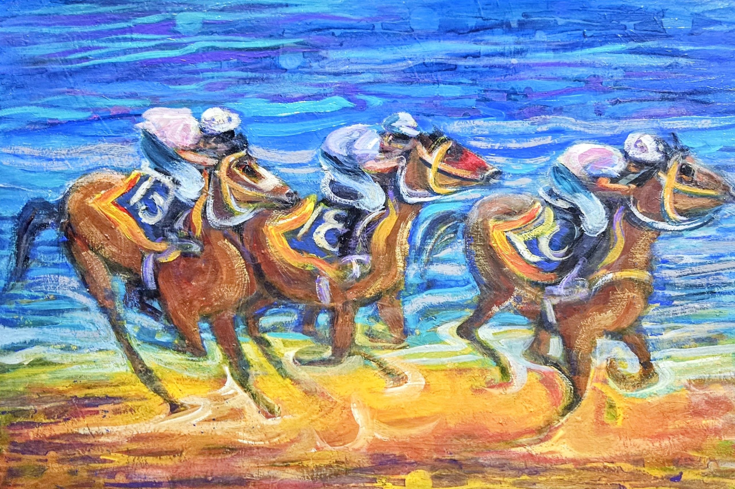 Magic millions horses are warming up.a quick sprint on the golden sands .subtle tones of warm and cool blues complimented with turquoise capturing the feel of the ocean backdrop behind the jockeys on their warm up run.