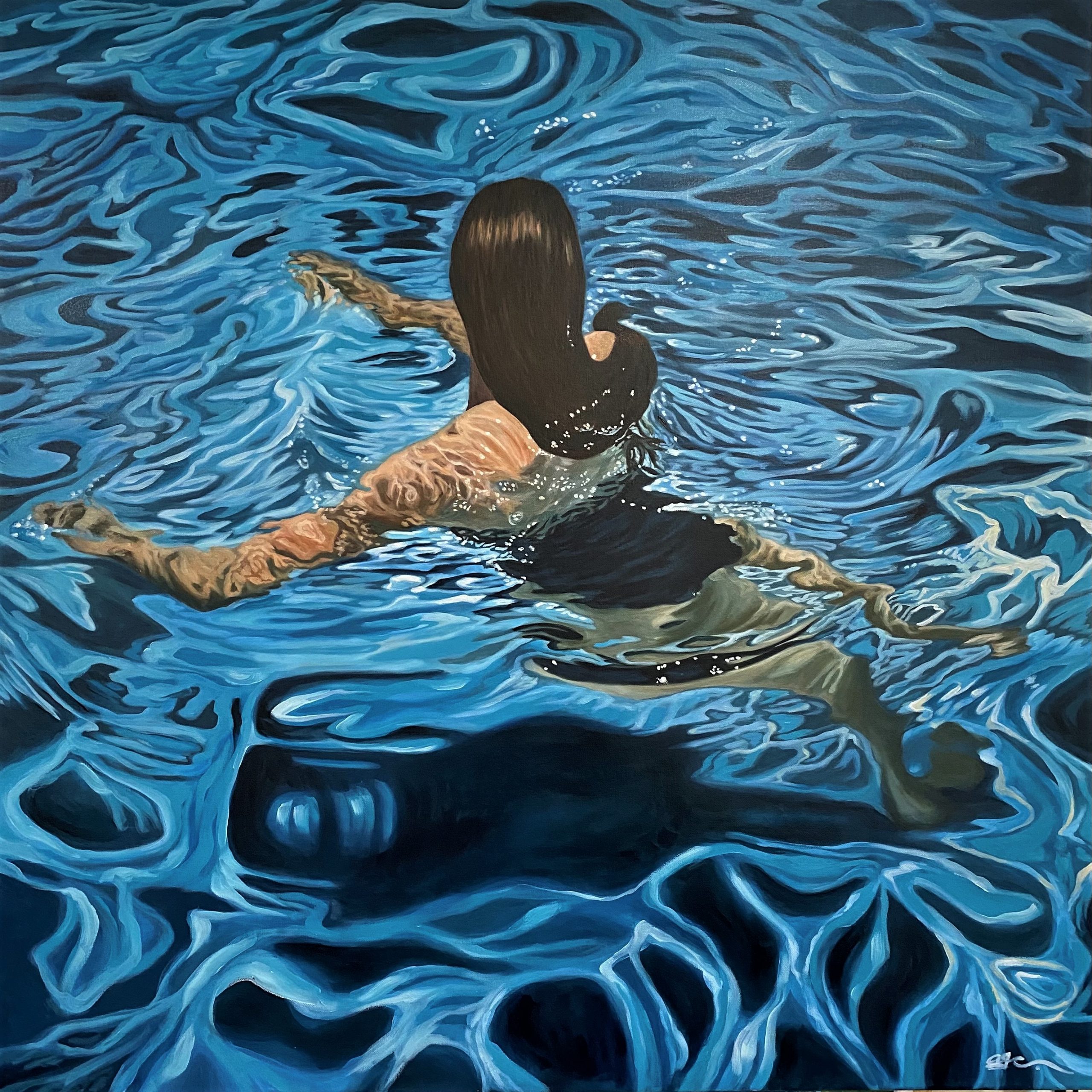 Radiance by Amanda Cameron – One of my ‘Swimmer Series’ of paintings and is an investigation into the interaction and connection between light, water and form. Amanda’s work is focused on the quest for finding refuge, quietness and escapism. Some [paintings] focus on the lone swimmer, the few minutes of introspection when submerged in the warm quiet of water, and others investigate the interaction of people within various aspects of the landscape. I haven’t settled on any particular style, and constantly struggle with the juxtaposition between hyper-realism and having a painterly quality to my art and this conflict in my paintings is what I am always trying to balance. This piece is painted in professional quality oil paints on a museum quality canvas, and finished with edges painted and a gloss varnish for protection. It comes with hanging wire and a certificate of authenticity.
