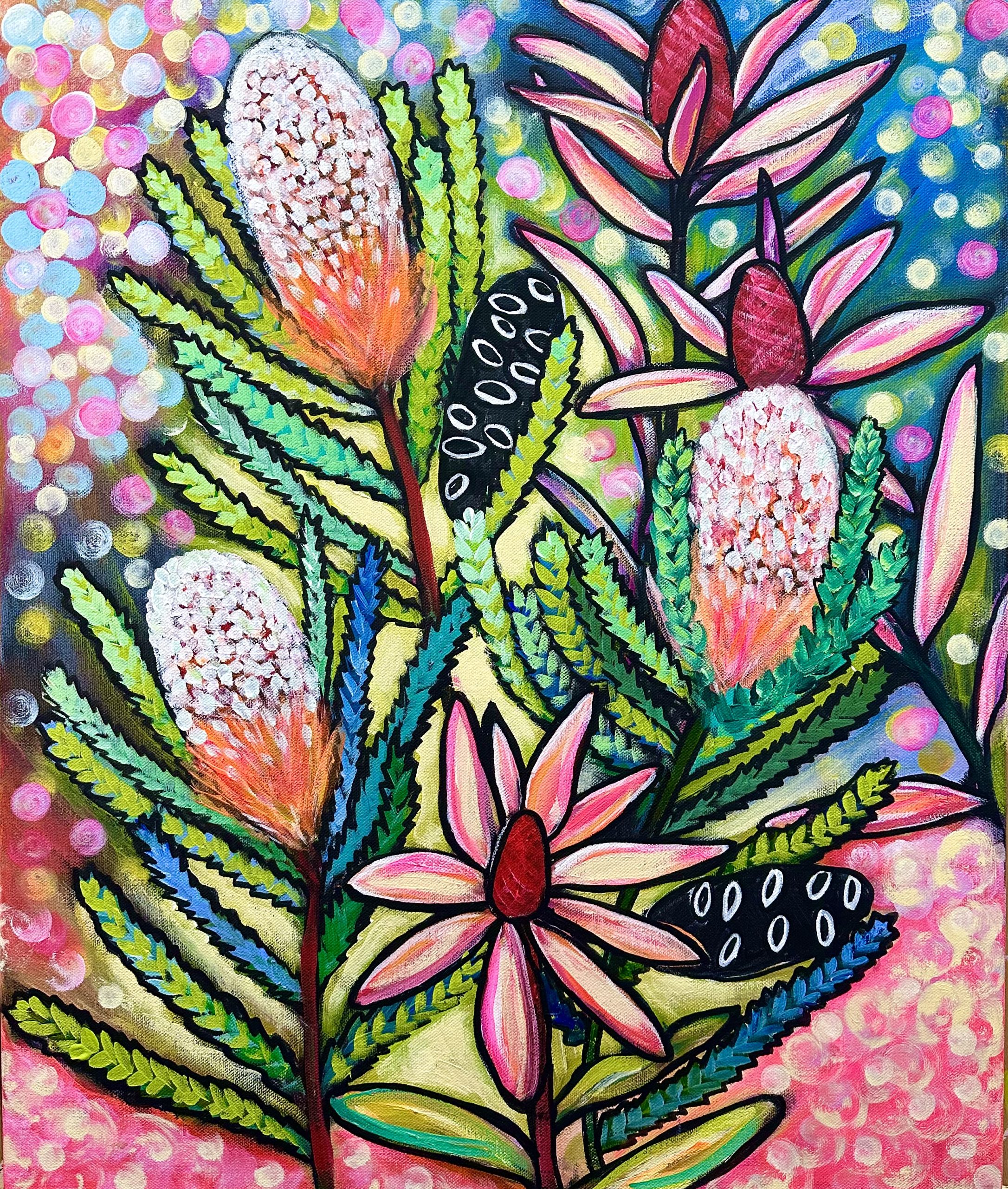 Inspired by a beautifully vibrant fresh native floral arrangement gifted as a birthday present. Memories of Kings Park Botanical Garden in Perth, where the most amazing banksias grow for all to see are also captured in this particular banksia painting.