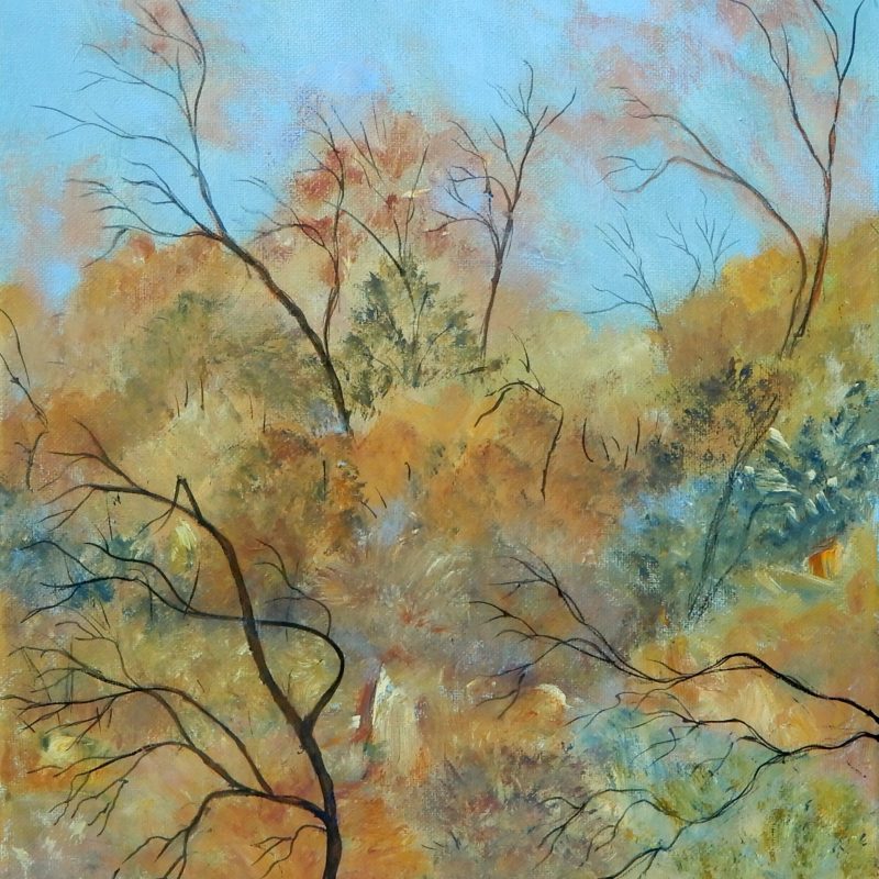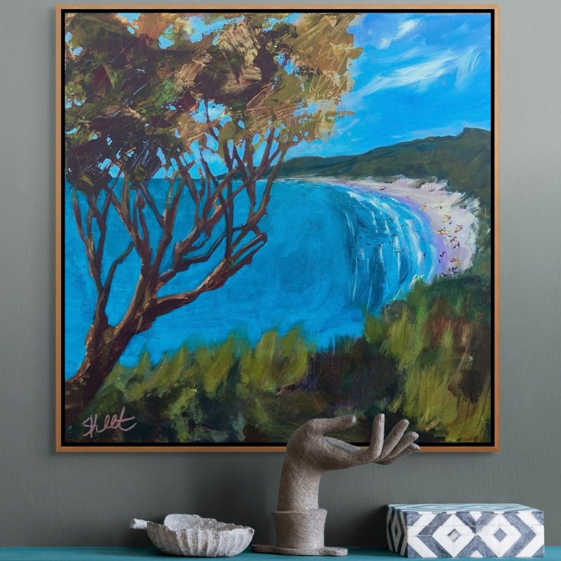 Rain over Red Bluff Cliffs by Roz McQuillan – Signed oil painting of rain approaching Red Bluff Cliffs, Black Rock, painted plein air. Ready to hang, with a creamy lightly textured wood frame.