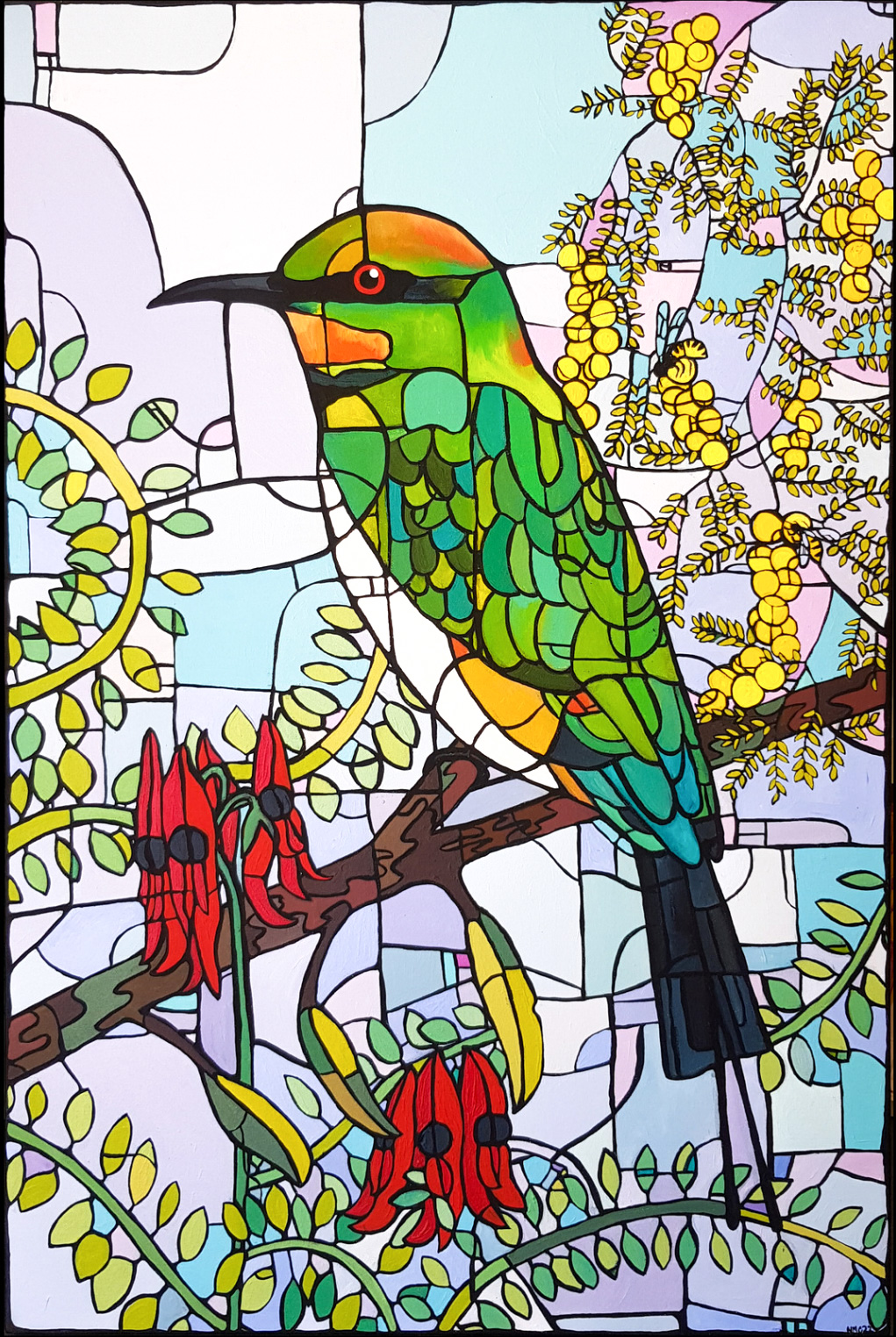 The stunning Rainbow Bee-eater is a joy to paint with amazing colours and shape. Depicted here in a stylized way with Sturt Desert Peas and yellow wattle.