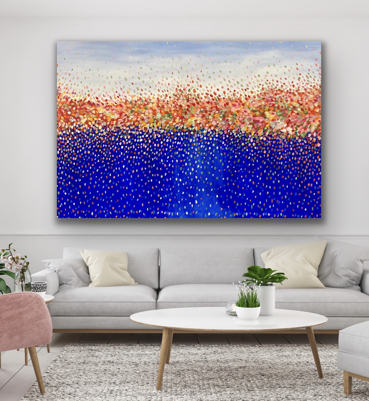 Rainbow Bouquet by Theo Papathomas a painting with so much depth with so many various shades of colours of the rainbow. A rainbow of petals hovering in the sky weeping on to the sea. Petals swept by the winds creating their own dance like musical notes exploding like fireworks in the sky . A beautiful bouquet of petals makes you feel it’s a sea of colours weeping onto the sea .A very peaceful and tranquil painting. The painting is signed and dated 2020 at the back and comes with a certificate of Authenticity.