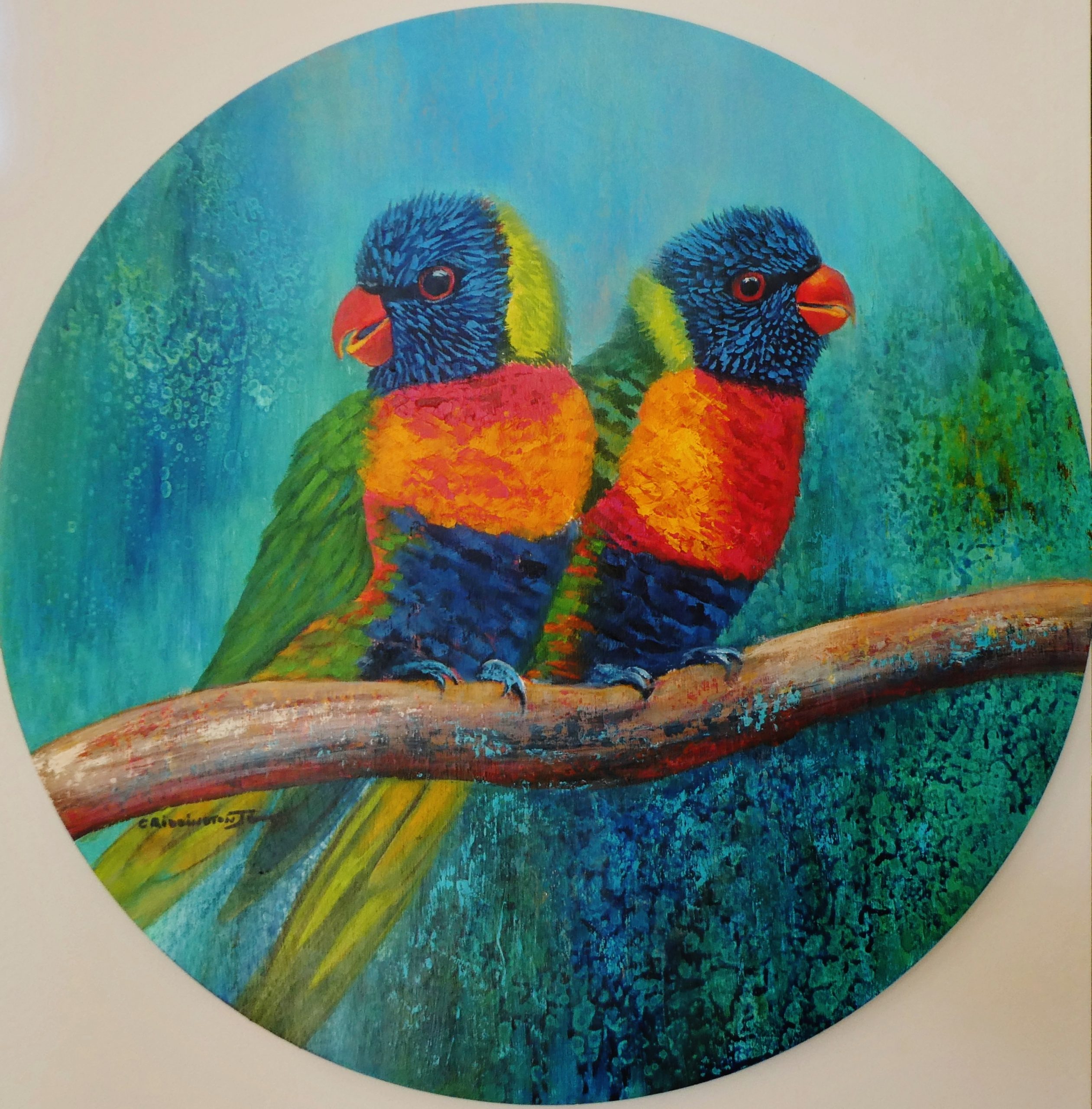 The Rainbow Lorikeet is one of the most colourful of the parrots found in Australia. Their favourite foods are nectar and pollen from native flowers. When my paperbark trees are flowering the Lorikeets descend and stay for days, swinging upside-down in the branches, feeding an chattering to each other. This is my impression of two of them in the branches of my paperbarks. It is painted on a timber art board and the unusual shape looks very interesting on any wall.